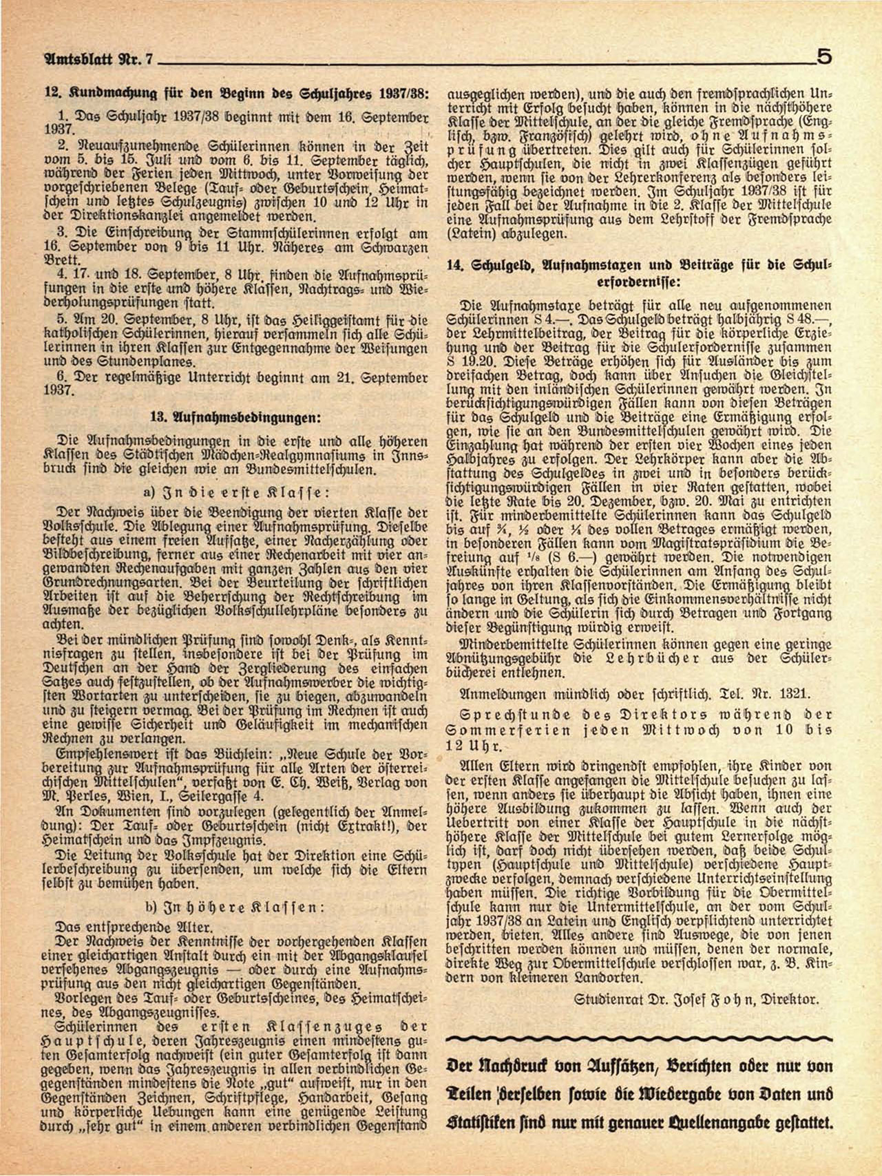 12. Kundmachung für den Beginn des Schuljahres 1937/38: