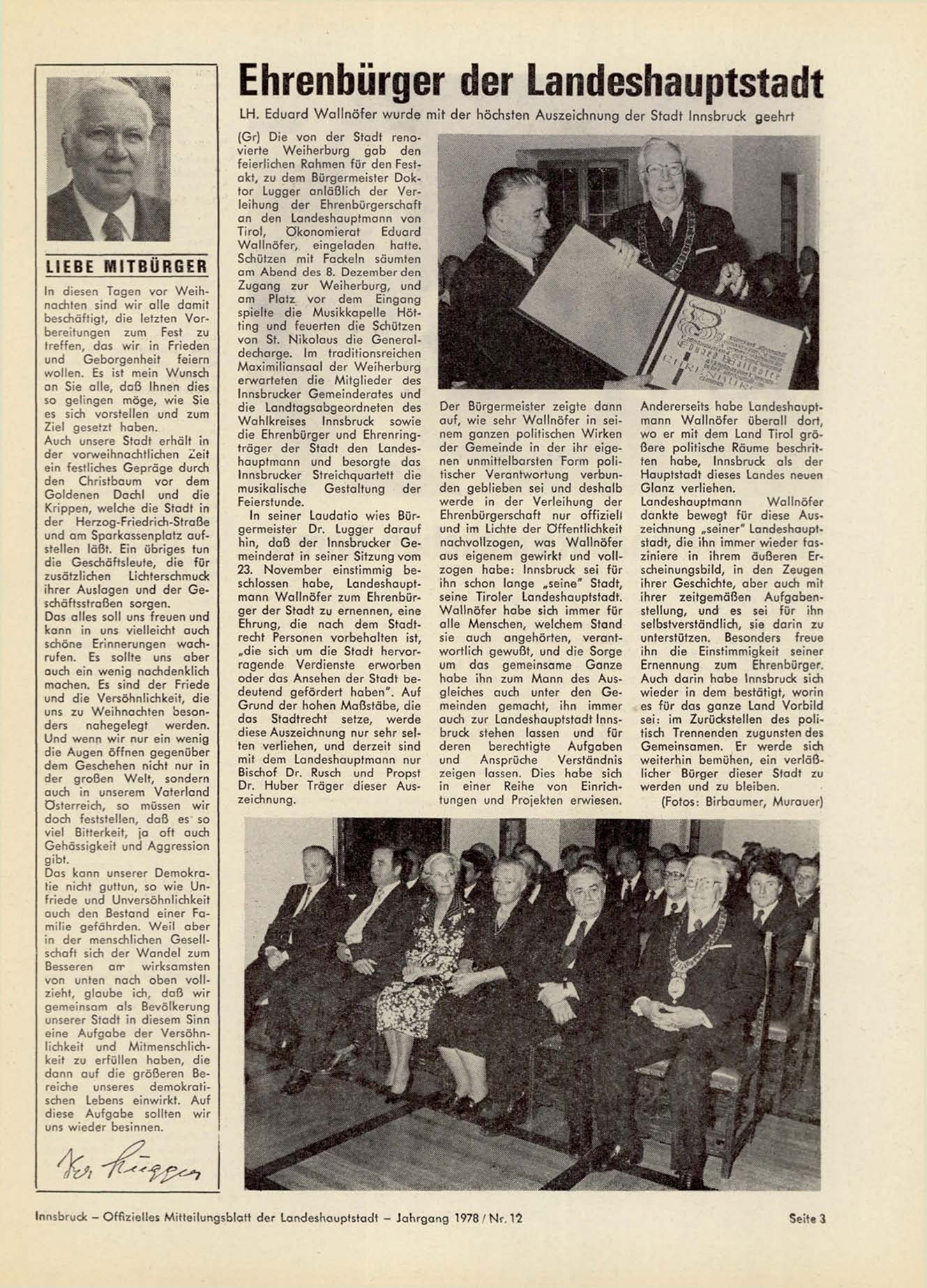 23. November einstimmig beschlossen habe, Landeshauptmann Wallnöfer zum Ehrenbürger der Stadt zu ernennen, eine
