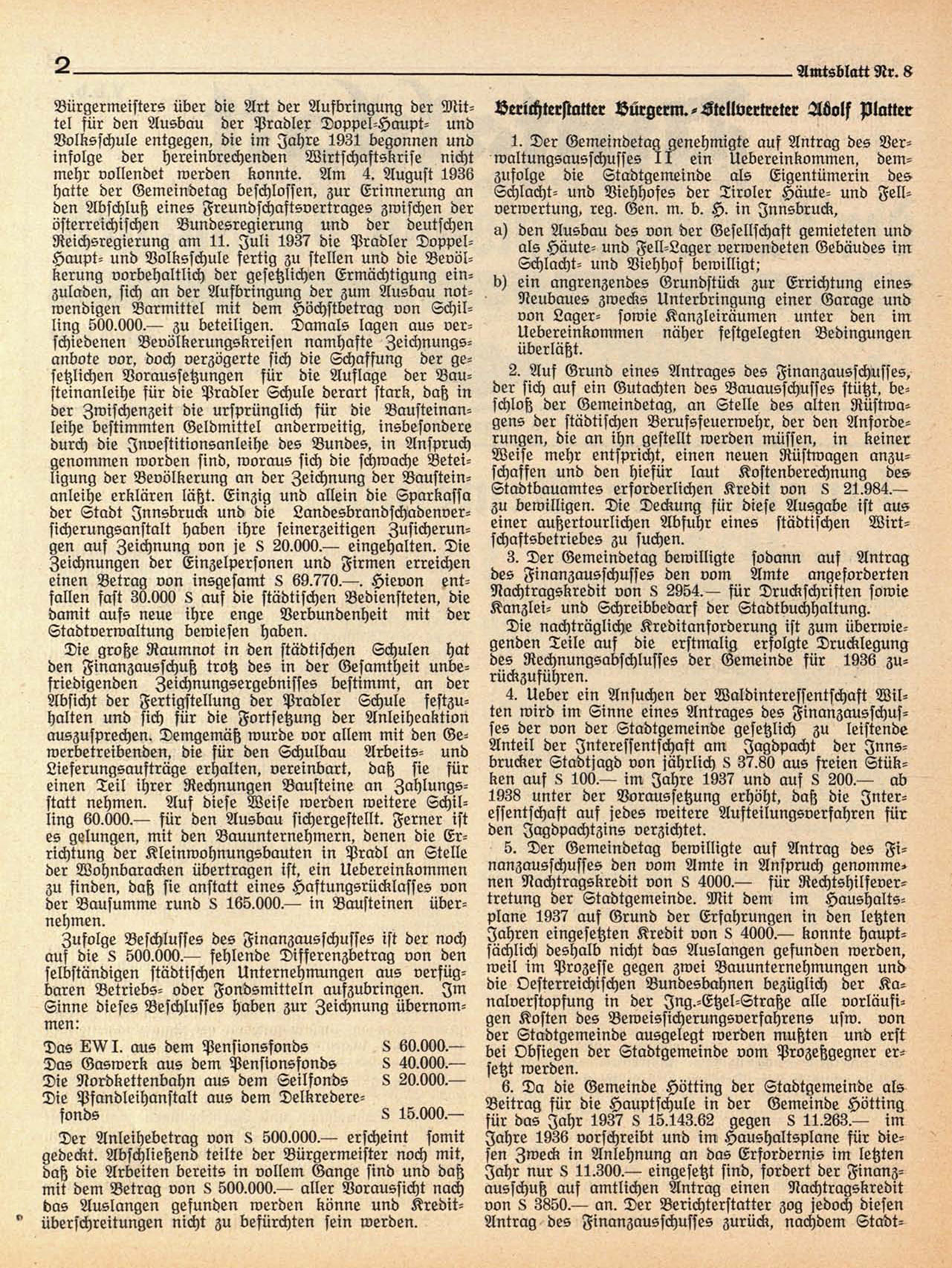 Reichsregierung am 11. Juli 1937 die Pradler DoppelHaupt- und Volksschule fertig zu stellen und die Bevölkerung vorbehaltlich der gesetzlichen Ermächtigung einzuladen, sich an der Aufbringung der zum Ausbau notwendigen Barmittel mit dem Höchstbetrag von Schilling 500.000.— zu beteiligen. Damals lagen aus verschiedenen Bevölkerungskreisen namhafte Zeichnungsanbote vor, doch verzögerte sich die Schaffung der gesetzlichen Voraussetzungen für die Auflage der Vausteinanleihe für die Pradler Schule derart stark, daß in