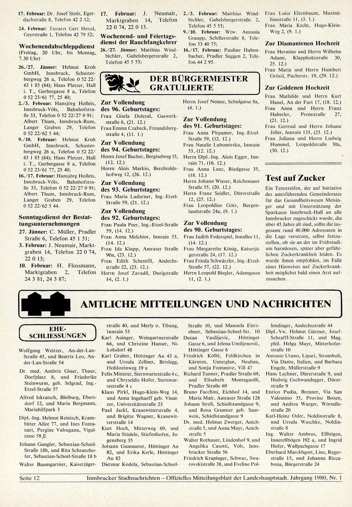 Innsbrucker Stadtnachrichten - Offizielles Mitteilungsblatt der Landeshauptstadt. Jahrgang 1980, N r . 1