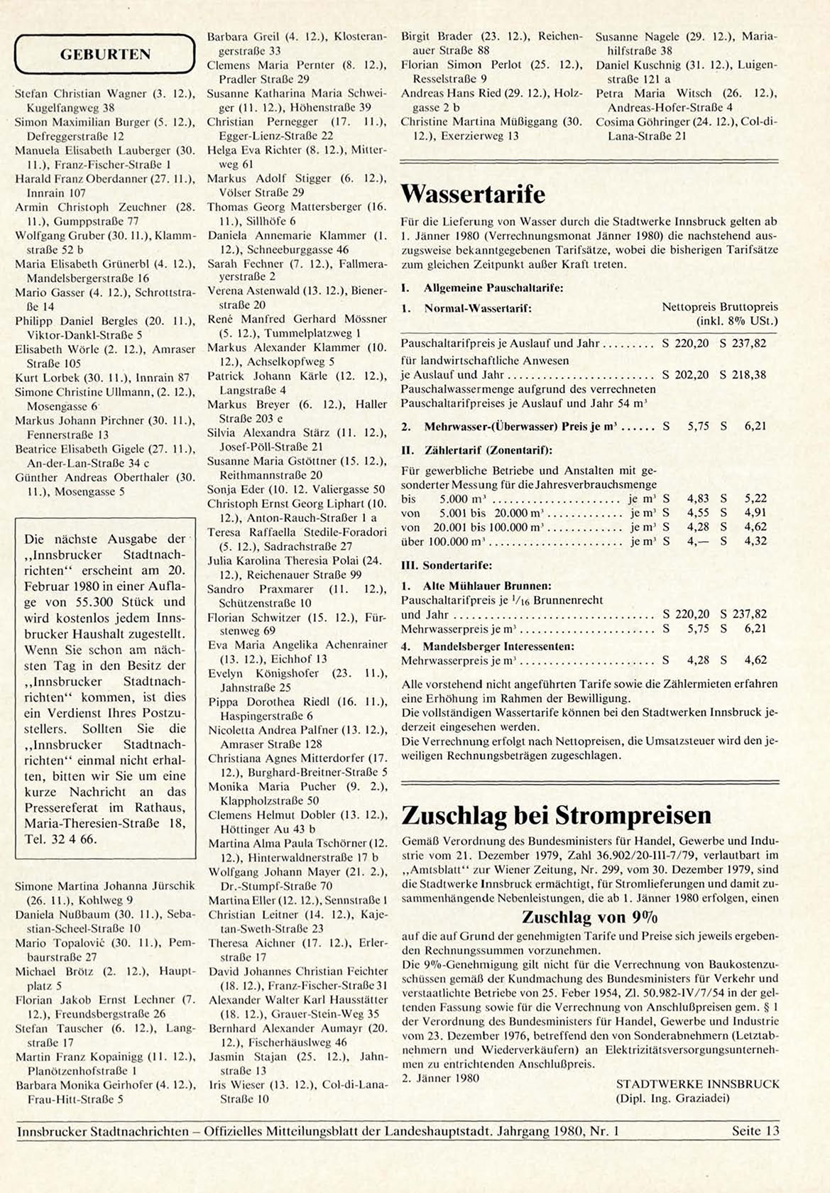 Innsbrucker Stadtnachrichten - Offizielles Mitteilungsblatt der Landeshauptstadt. Jahrgang 1980, Nr. 1