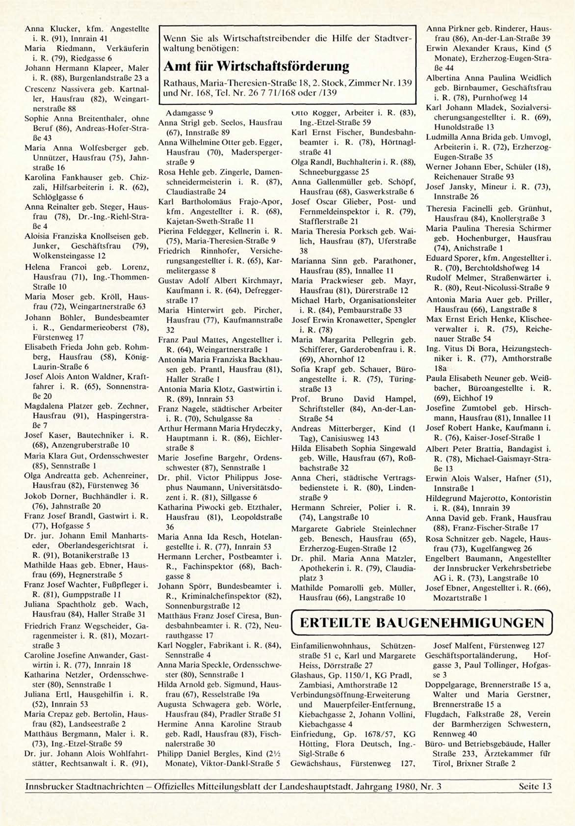 Innsbrucker Stadtnachrichten - Offizielles Mitteilungsblatt der Landeshauptstadt. Jahrgang 1980, Nr. 3