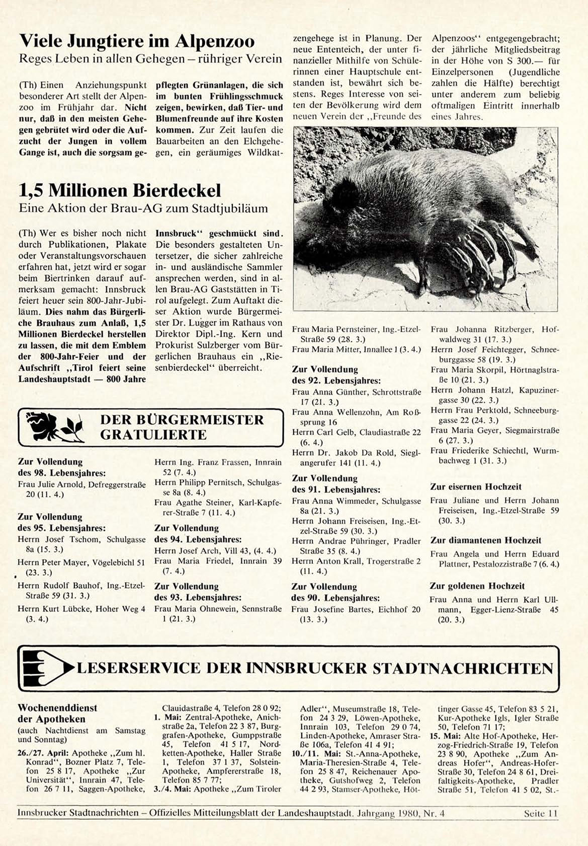 Innsbrucker Stadtnachrichten - Offizielles Mitteilungsblatt der Landeshauptstadt. Jahrgang 1980, N r . 4