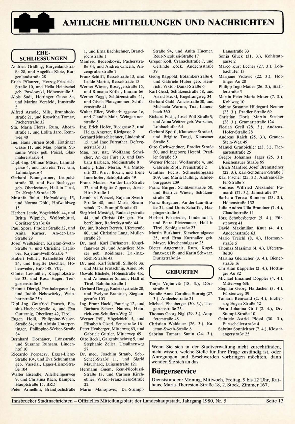 Innsbrucker Stadtnachrichten - Offizielles Mitteilungsblatt der Landeshauptstadt. Jahrgang 1980, N r . 5
