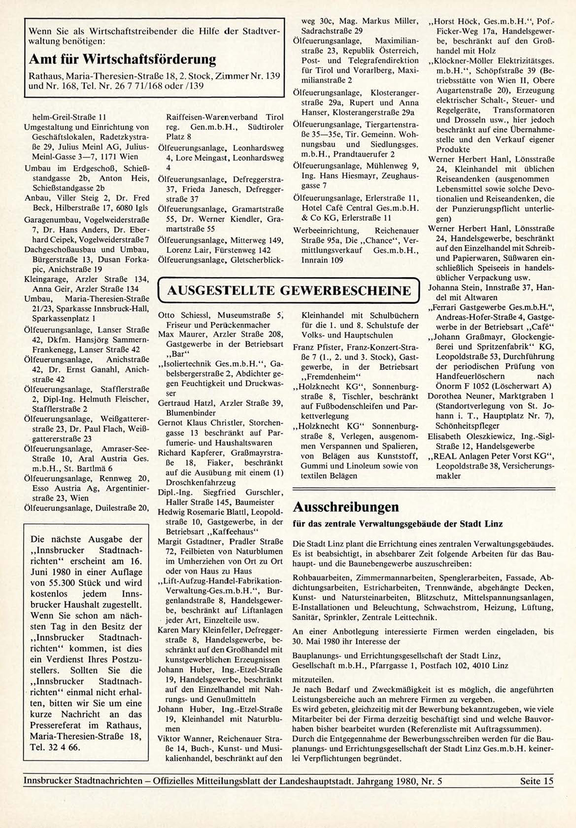 Innsbrucker Stadtnachrichten - Offizielles Mitteilungsblatt der Landeshauptstadt. Jahrgang 1980, N r . 5