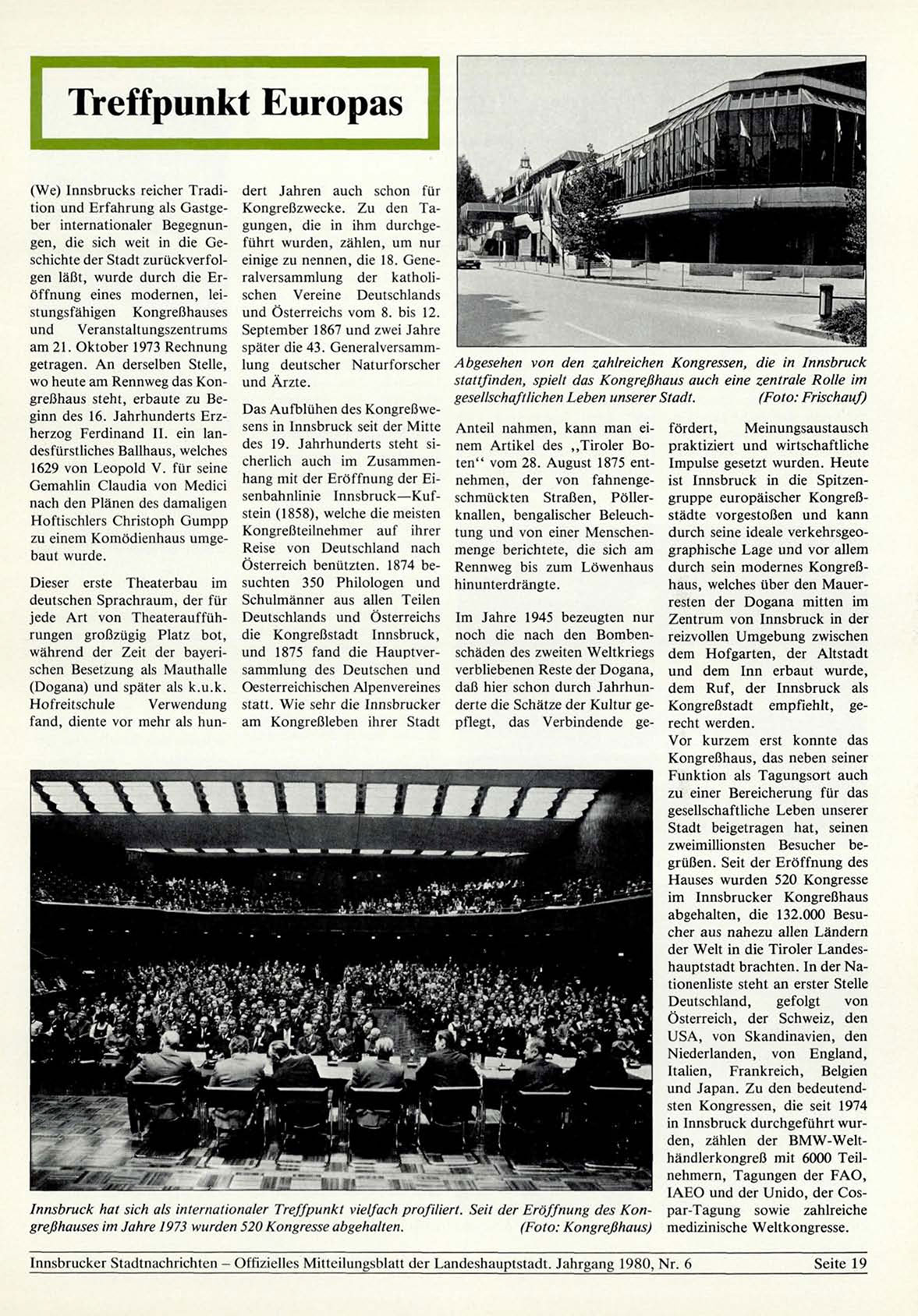 Innsbruck hat sich als internationaler Treffpunkt vielfach profiliert. Seit der Eröffnung des Kongreßhauses im Jahre 1973 wurden 520 Kongresse abgehalten.