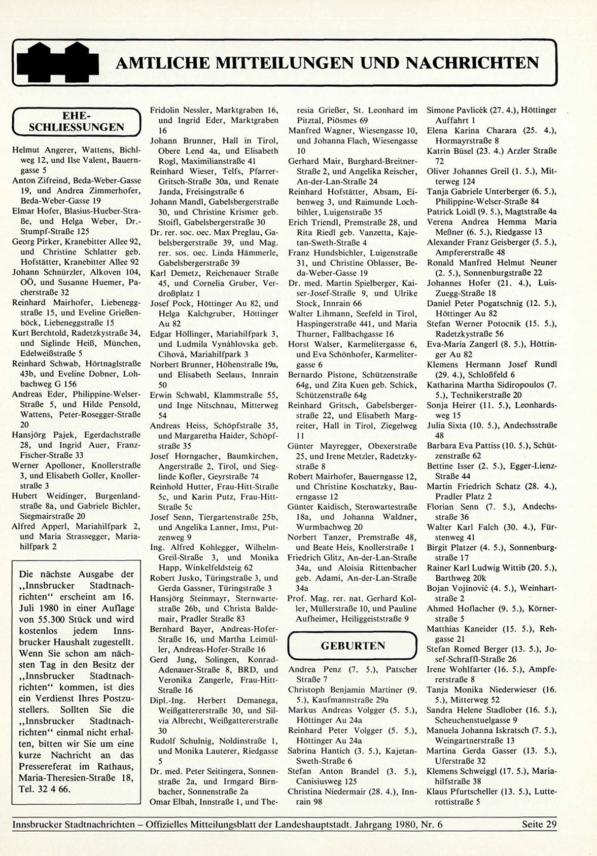 Innsbrucker Stadtnachrichten - Offizielles Mitteilungsblatt der Landeshauptstadt. Jahrgang 1980, Nr. 6