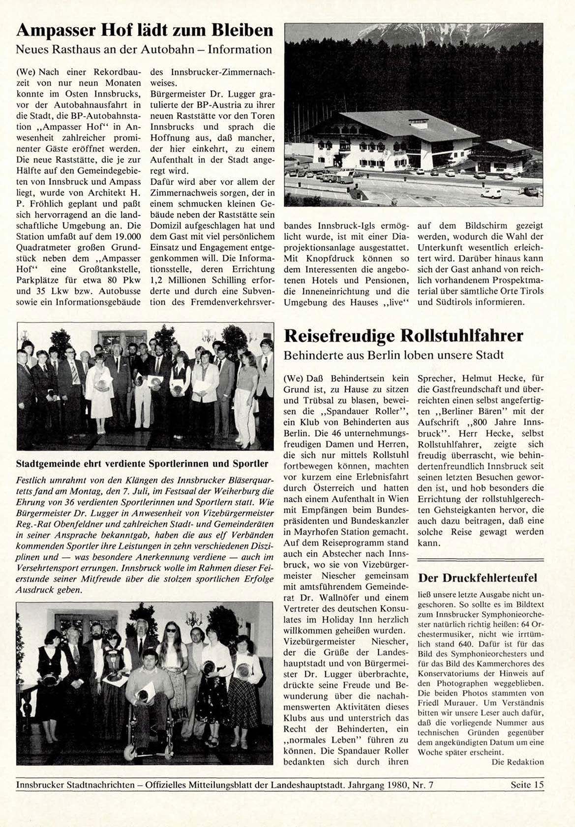 Innsbrucker Stadtnachrichten - Offizielles Mitteilungsblatt der Landeshauptstadt. Jahrgang 1980, N r . 7