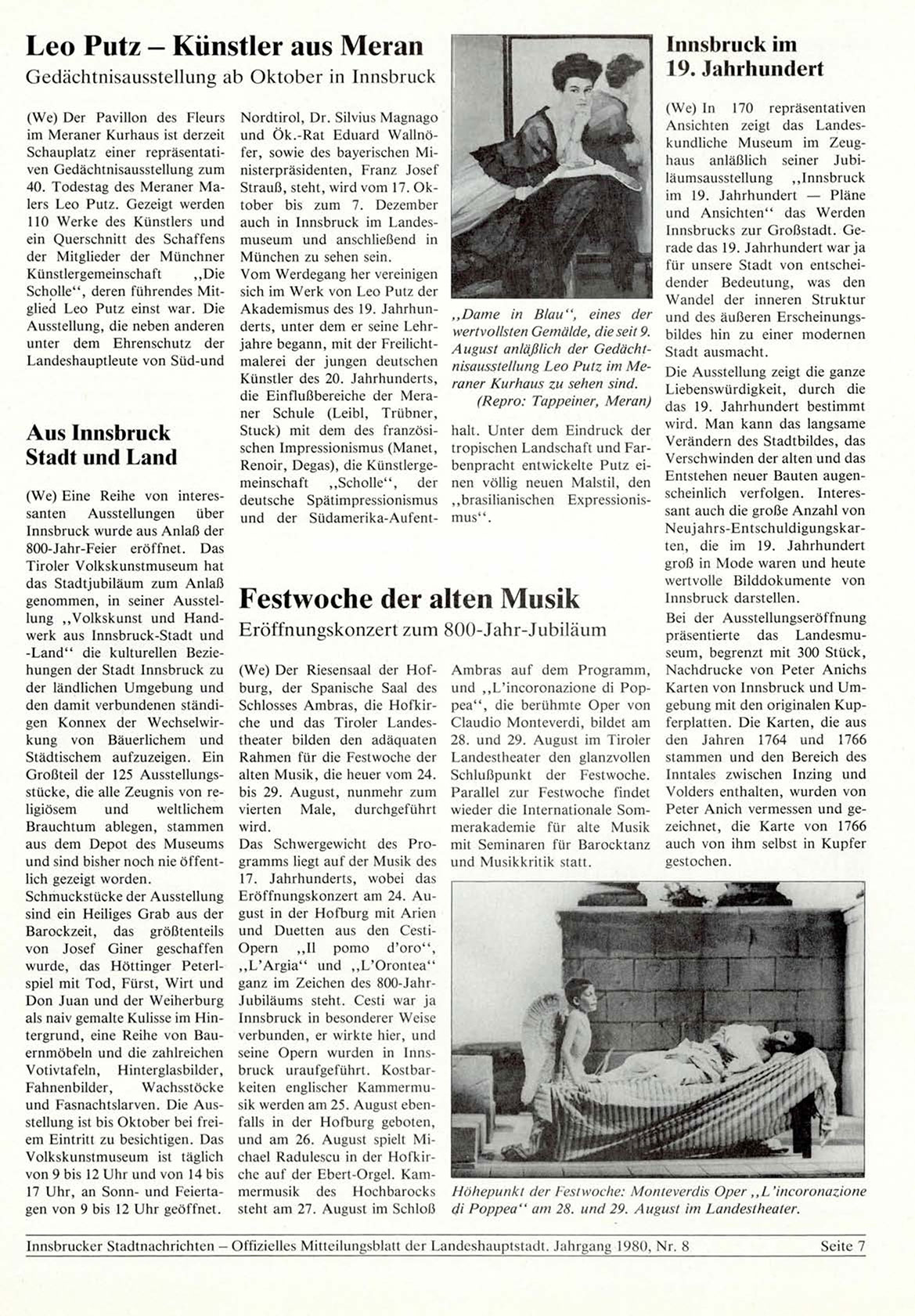 Innsbrucker Stadtnachrichten — Offizielles Mitteilungsblatt der Landeshauptstadt. Jahrgang 1980, N r . 8