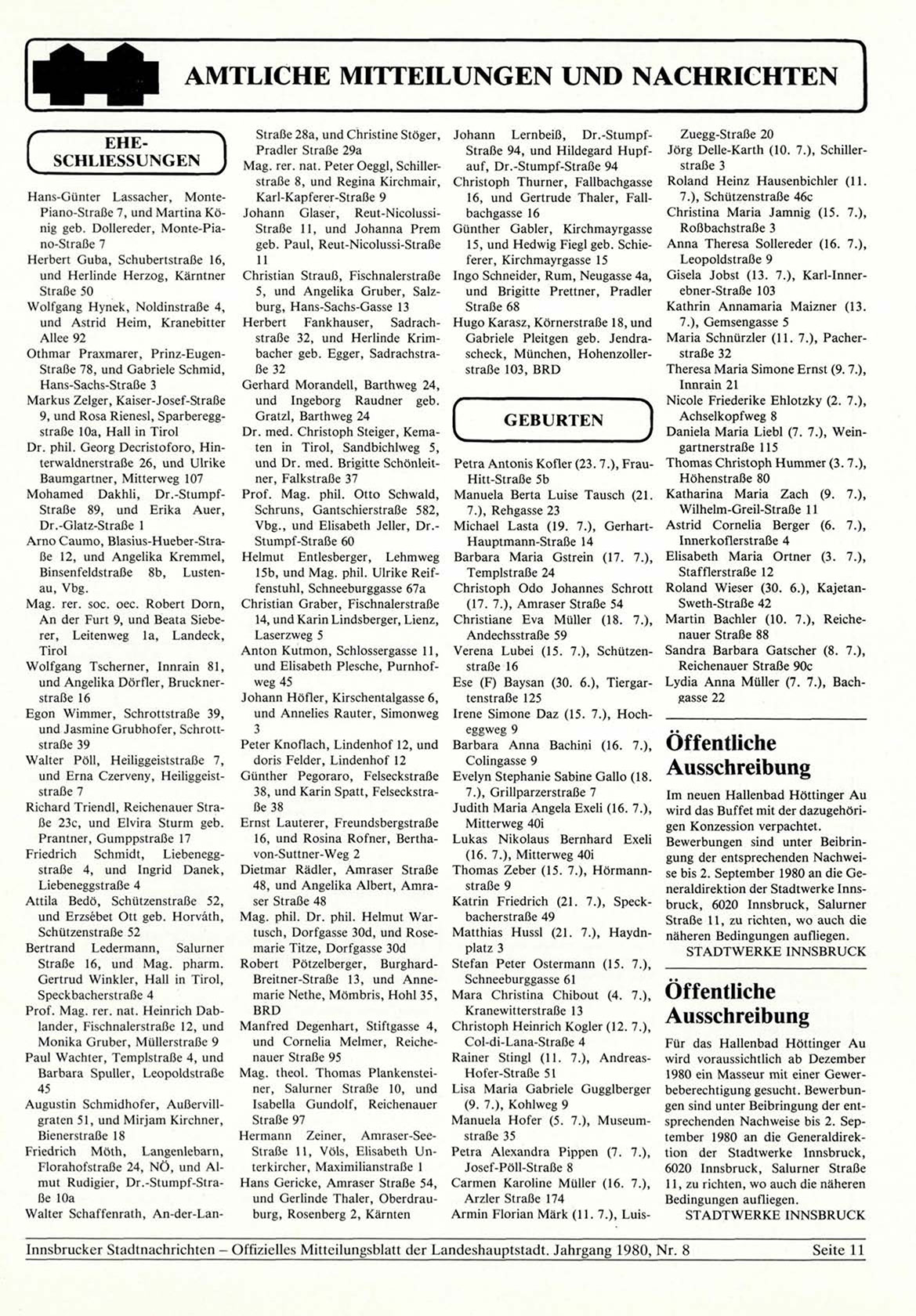 Innsbrucker Stadtnachrichten - Offizielles Mitteilungsblatt der Landeshauptstadt. Jahrgang 1980, N r . 8
