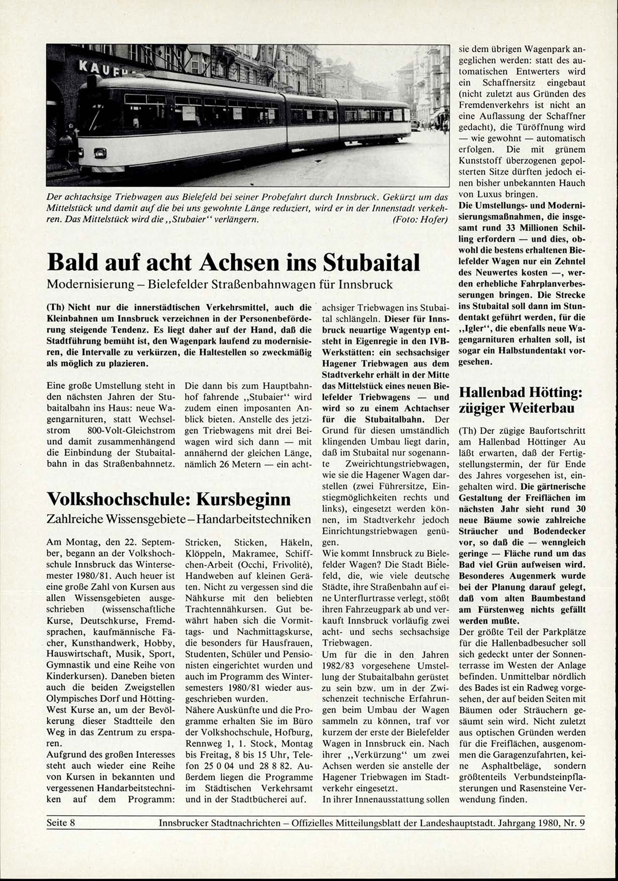Innsbrucker Stadtnachrichten - Offizielles Mitteilungsblatt der Landeshauptstadt. Jahrgang 1980, N r . 9