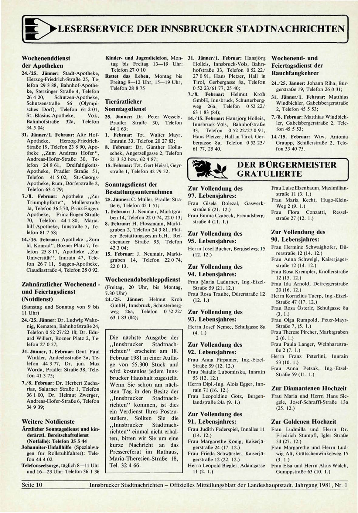 Innsbrucker Stadtnachrichten - Offizielles Mitteilungsblatt der Landeshauptstadt. Jahrgang 1981, Nr. 1