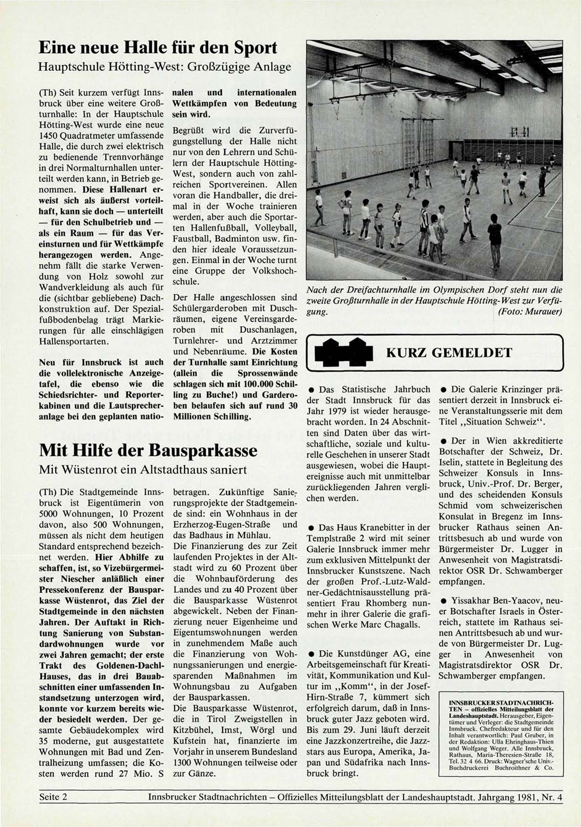 Innsbrucker Stadtnachrichten - Offizielles Mitteilungsblatt der Landeshauptstadt. Jahrgang 1981, Nr. 4