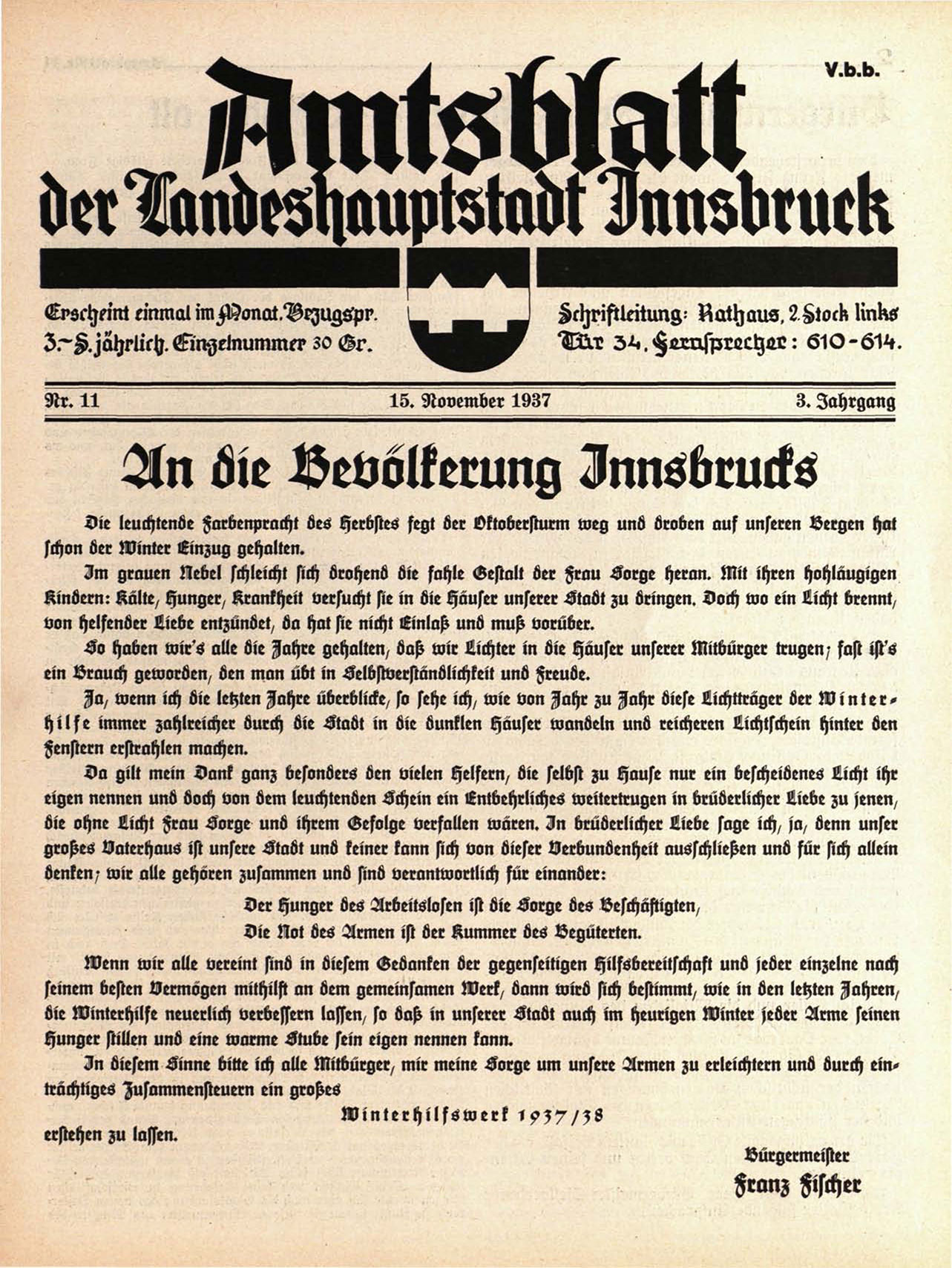 I n öiesem Sinne bitte ich alle Mitbürger, mir meine Sorge um unsere Armen zu erleichtem unö öurch eintrachtiges Jusammensteuern ein großes