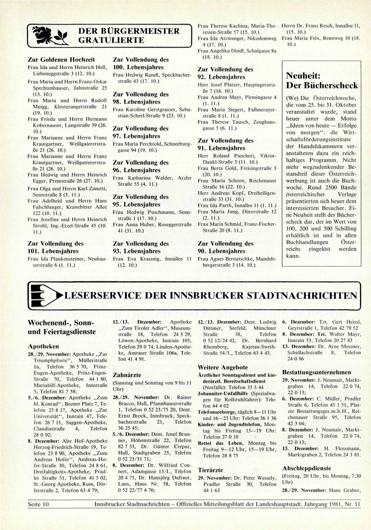 Innsbrucker Stadtnachrichten - Offizielles Mitteilungsblatt der Landeshauptstadt. Jahrgang 1981, Nr. 11