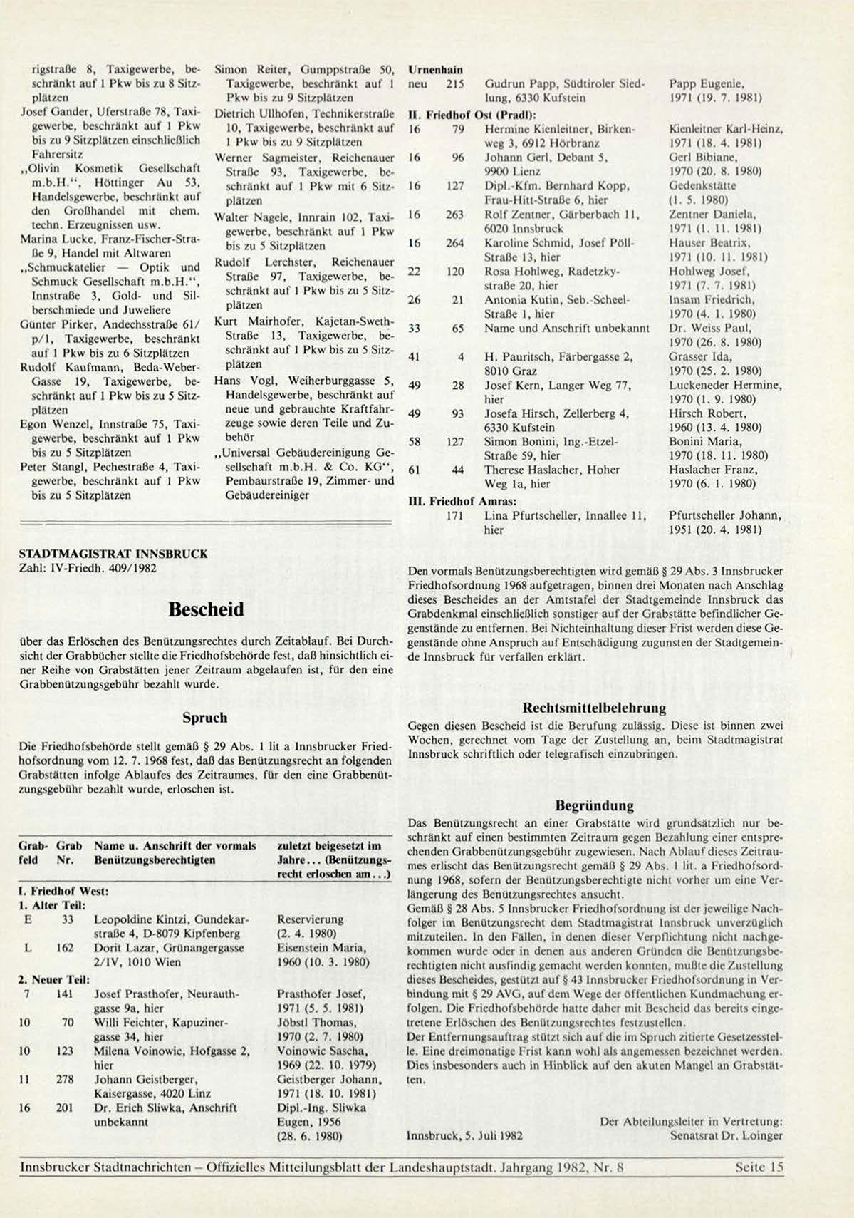 Die F r i e d h o f s b e h ö r d c stellt g e m ä ß § 29 A b s . 1 lit a Innsbrucker Friedhofsordnung vom 12. 7. 1968 fest, d a ß das Benützungsrecht an folgenden