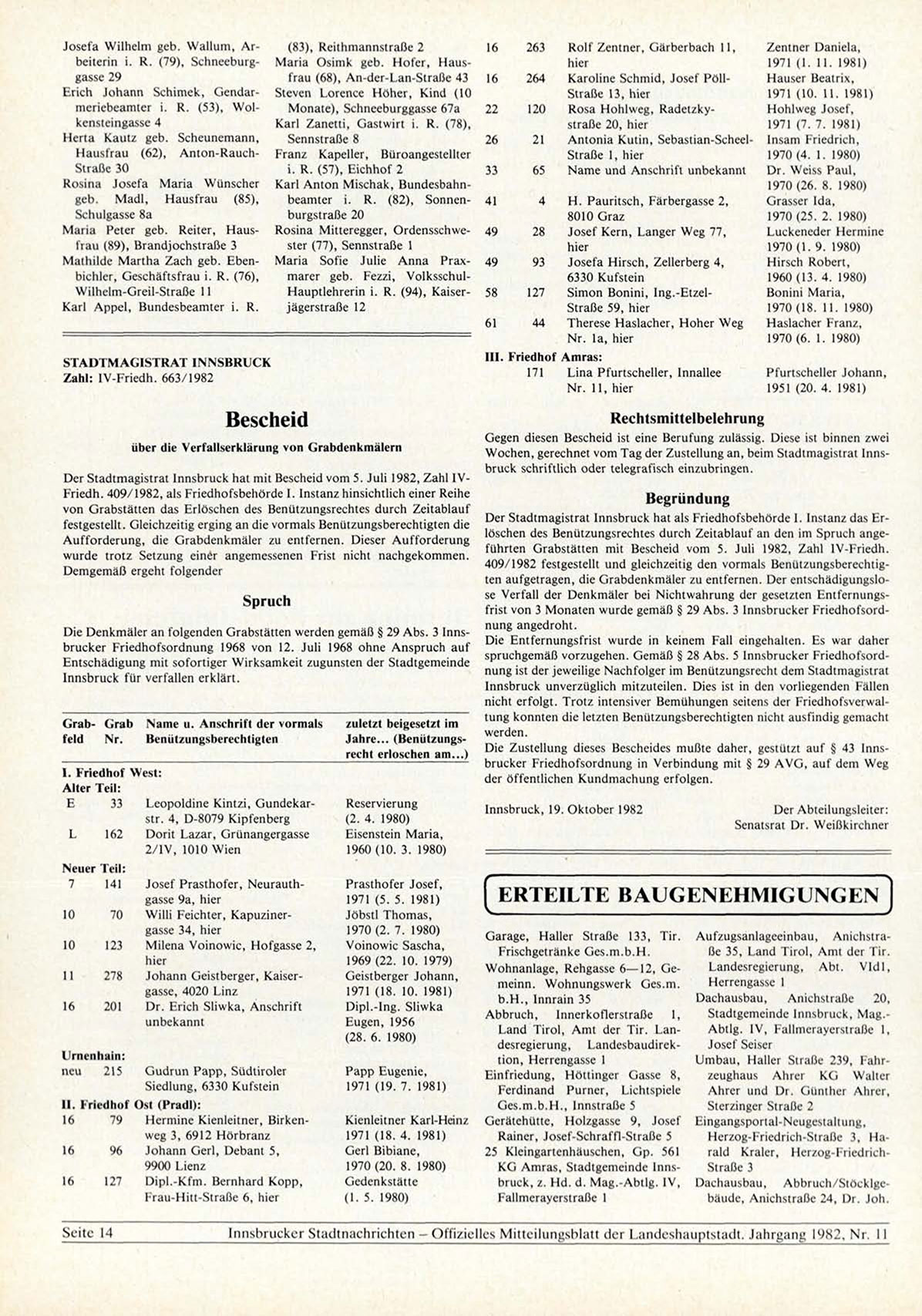 D e r S t a d t m a g i s t r a t I n n s b r u c k h a t m i t B e s c h e i d v o m 5. J u l i 1982, Z a h l I V -