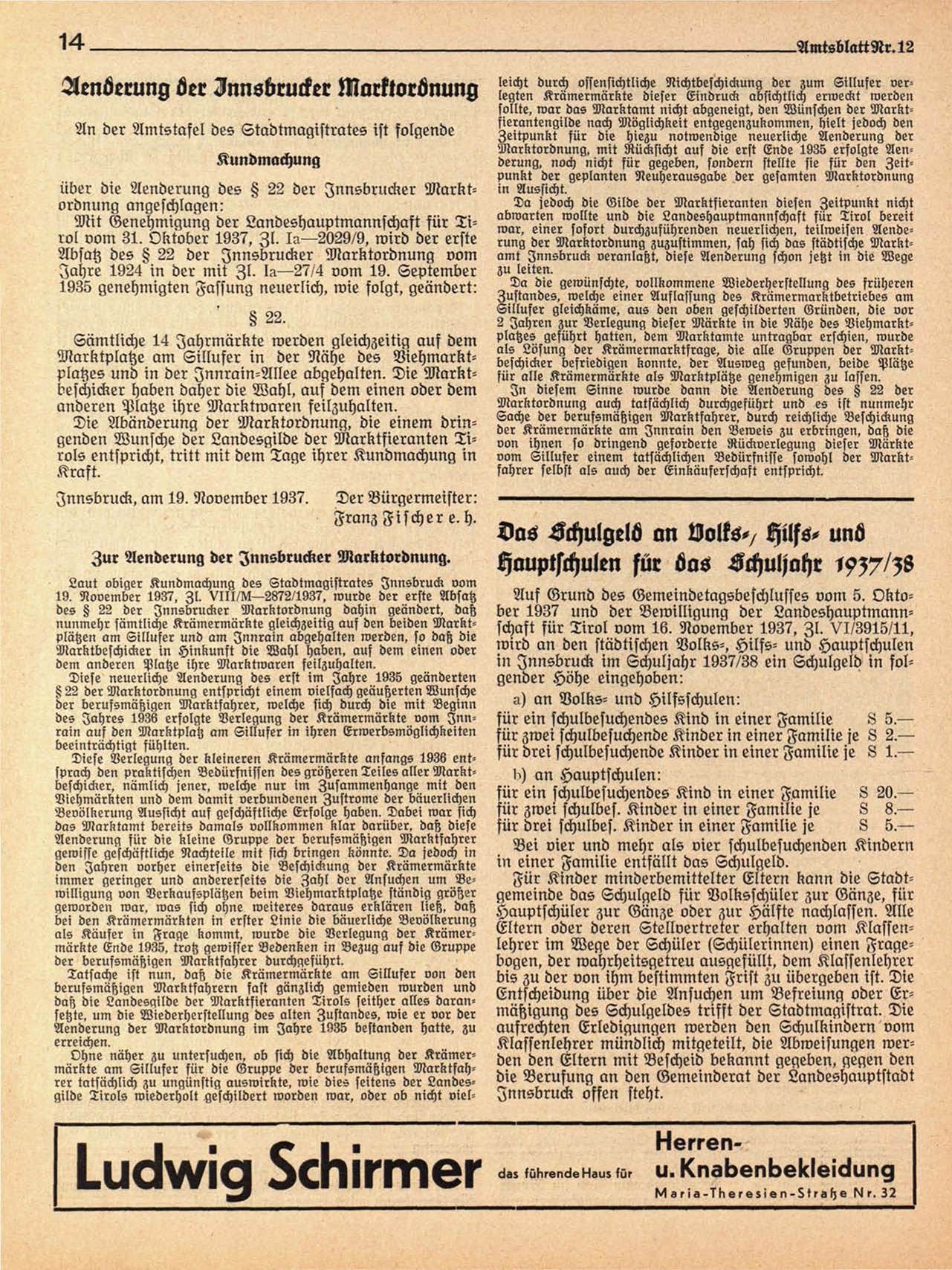 Mit Genehmigung der Landeshauptmannschaft für Tirol vom 31. Oktober 1937. Zl. 15—2029/9. wird der erste