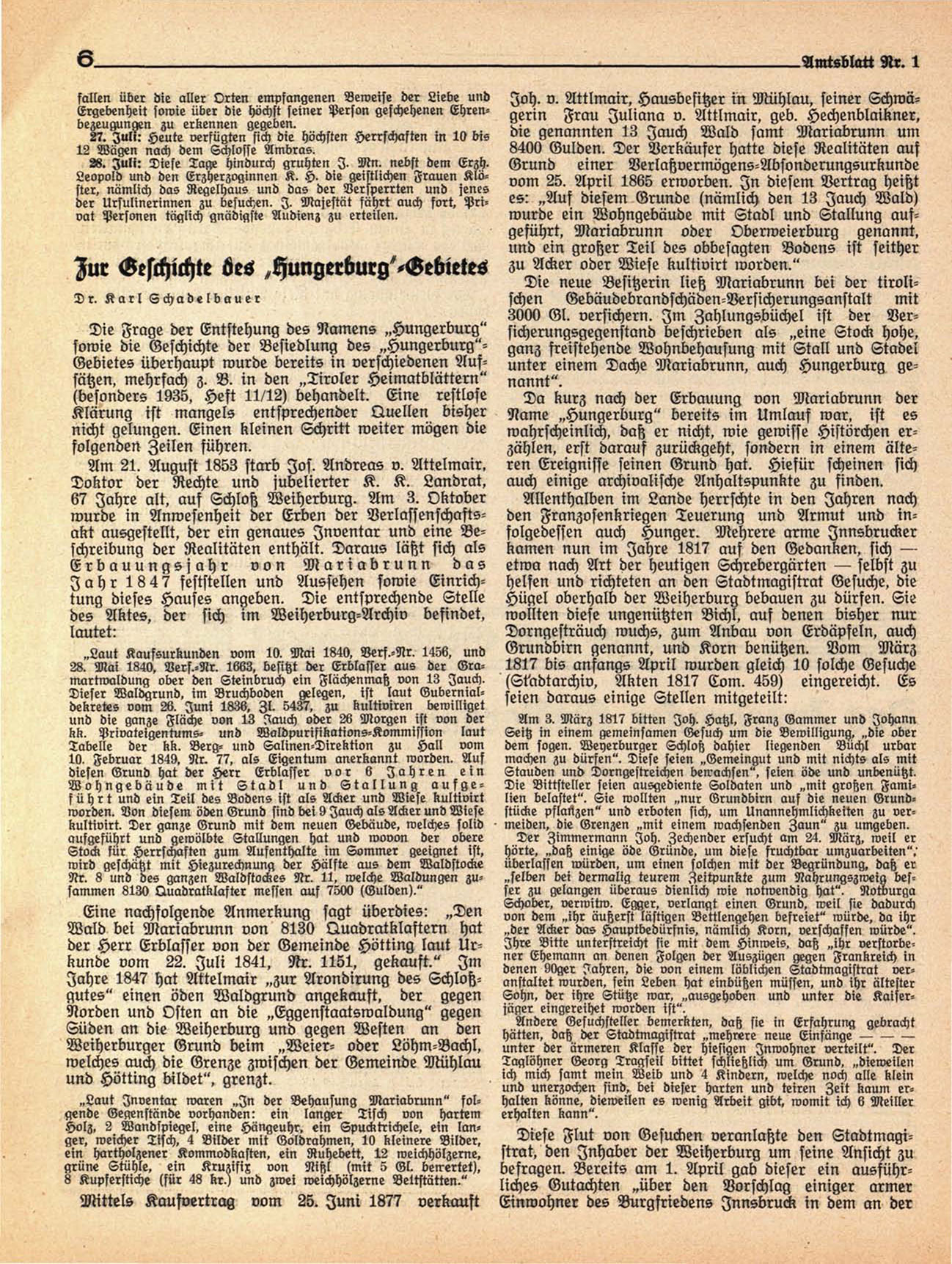 Gebietes überhaupt wurde bereits in verschiedenen Auf- unter einem Dache Mariabrunn, auch Hungerburg gesätzen, mehrfach g. B. in den „Tiroler Heimatblättern" nannt".