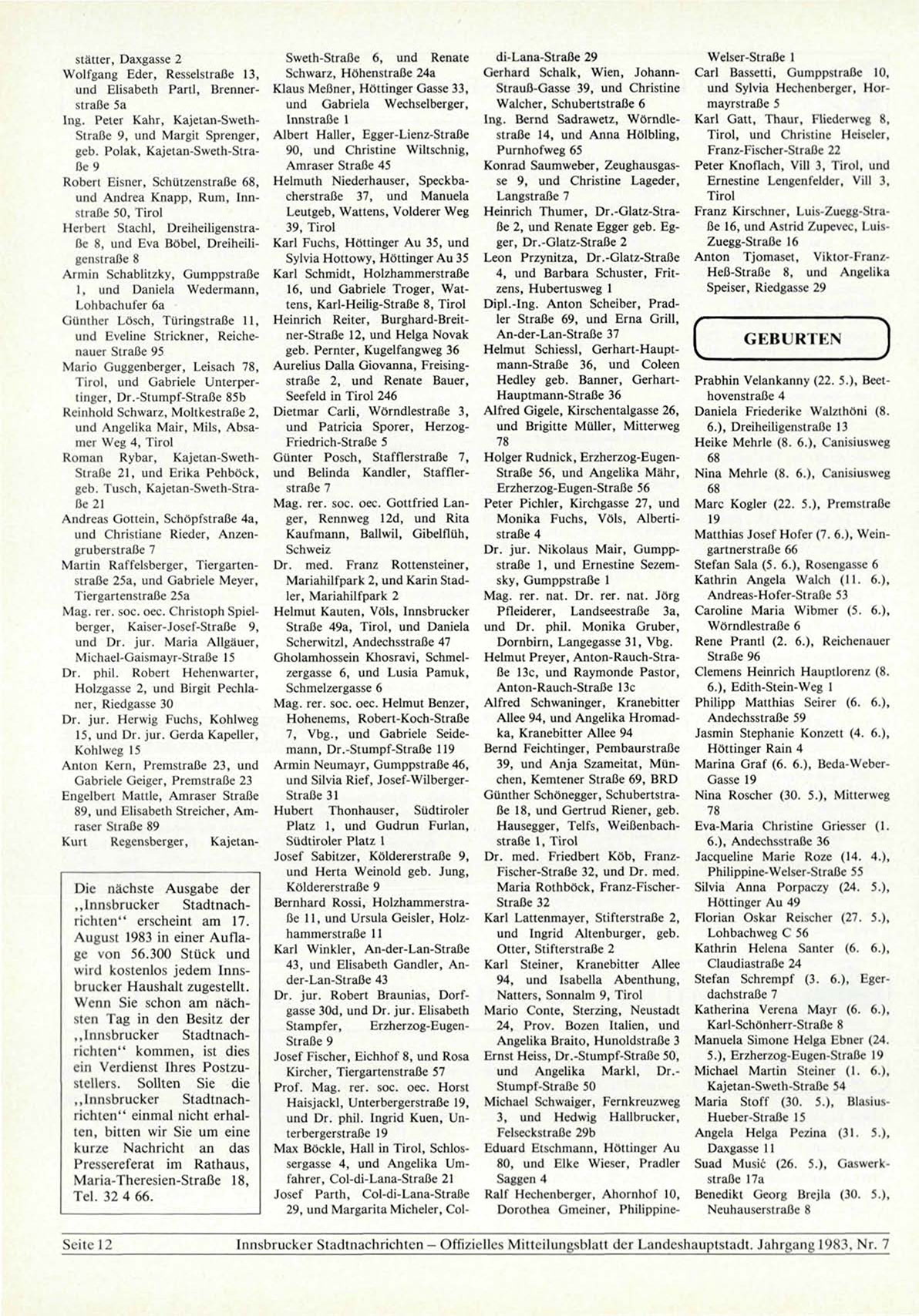 Innsbrucker Stadtnachrichten - Offizielles Mitteilungsblatt der Landeshauptstadt. Jahrgang 1983, Nr. 7