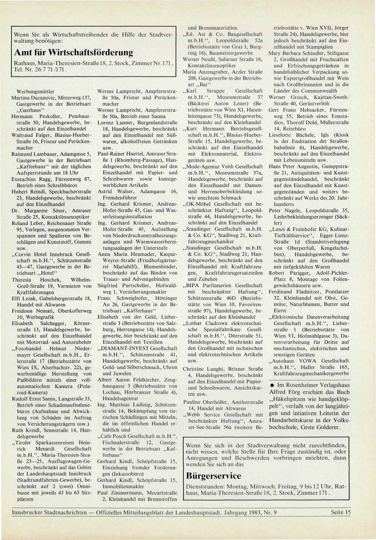 Innsbrucker Stadtnachrichten — Offizielles Mitteilungsblatt der Landeshauptstadt. Jahrgang 1983, Nr. 9