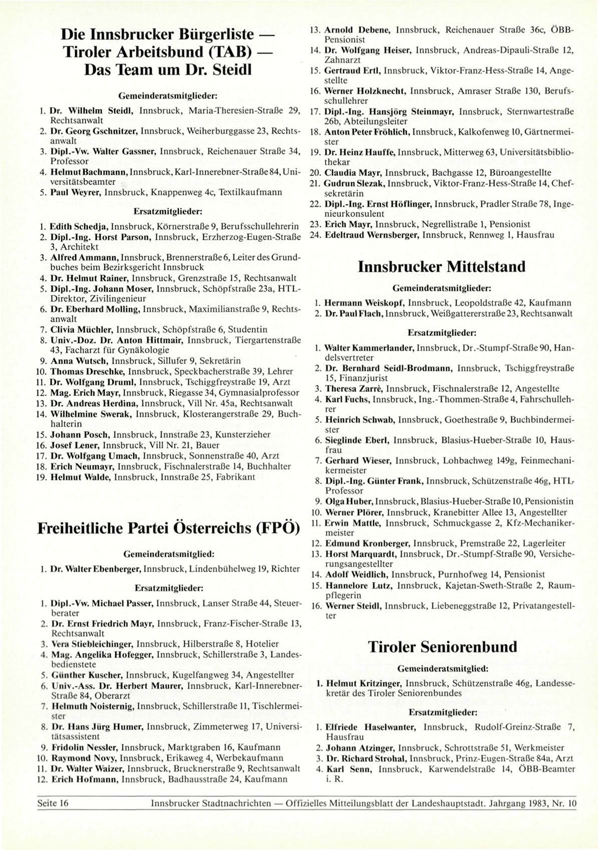 4. Karl Fuchs, Innsbruck, Ing.-Thommen-Straße4, Fahrschulleh13. Dr. Andreas Herdina, Innsbruck, Vili Nr. 45a, Rechtsanwalt