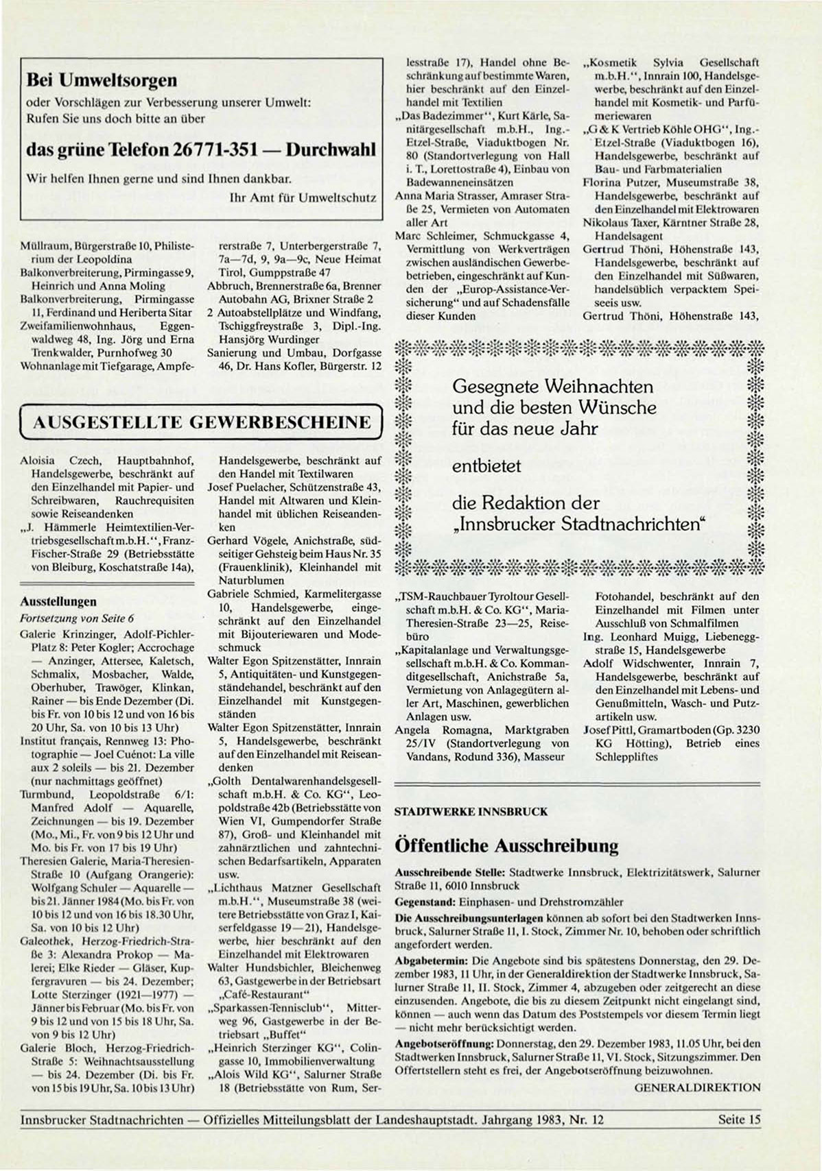 Innsbrucker Stadtnachrichten — Offizielles Mitteilungsblatt der Landeshauptstadt. Jahrgang 1983, Nr. 12