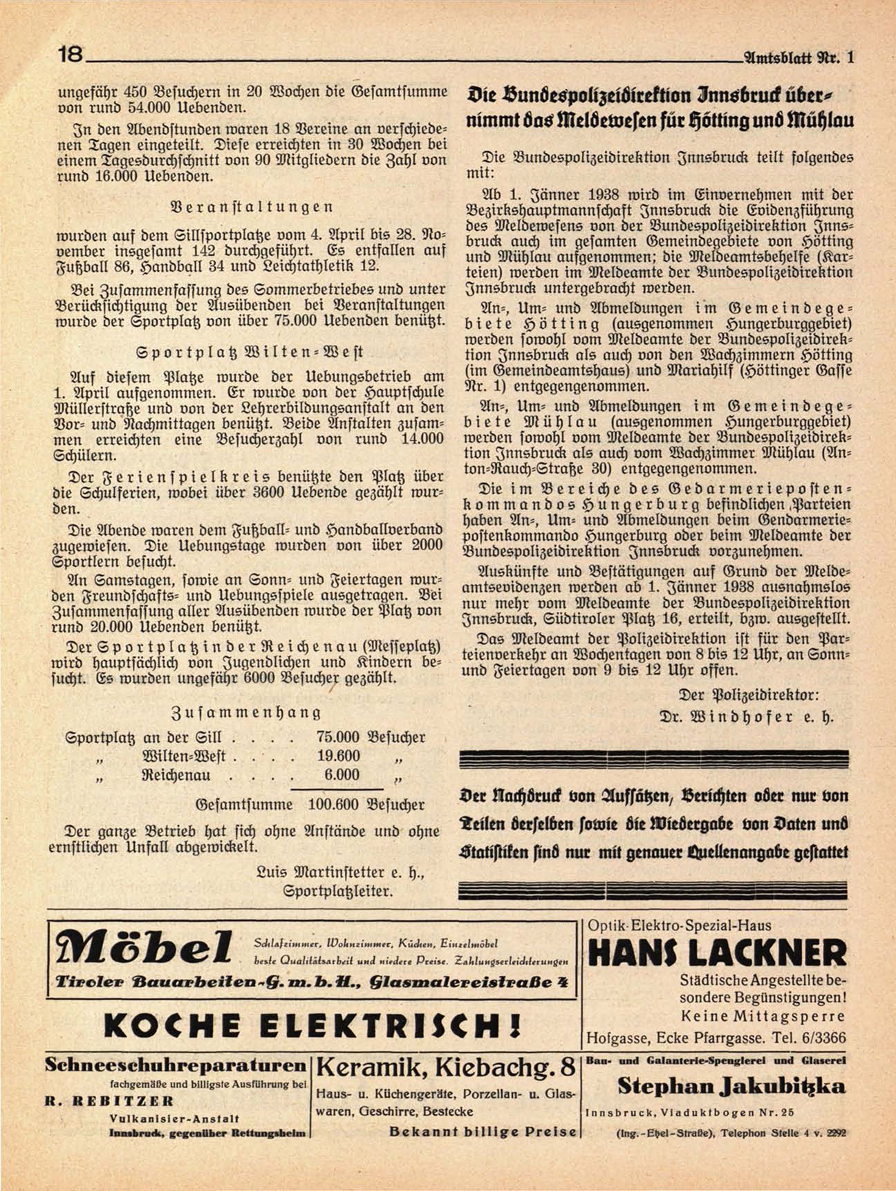 des Meldewesens von der Bundespolizeidirektion Innswurden auf dem Sillsportplatze vom 4. A p r i l bis 28. No- bruck auch im gesamten Gemeindegebiete von Hötting