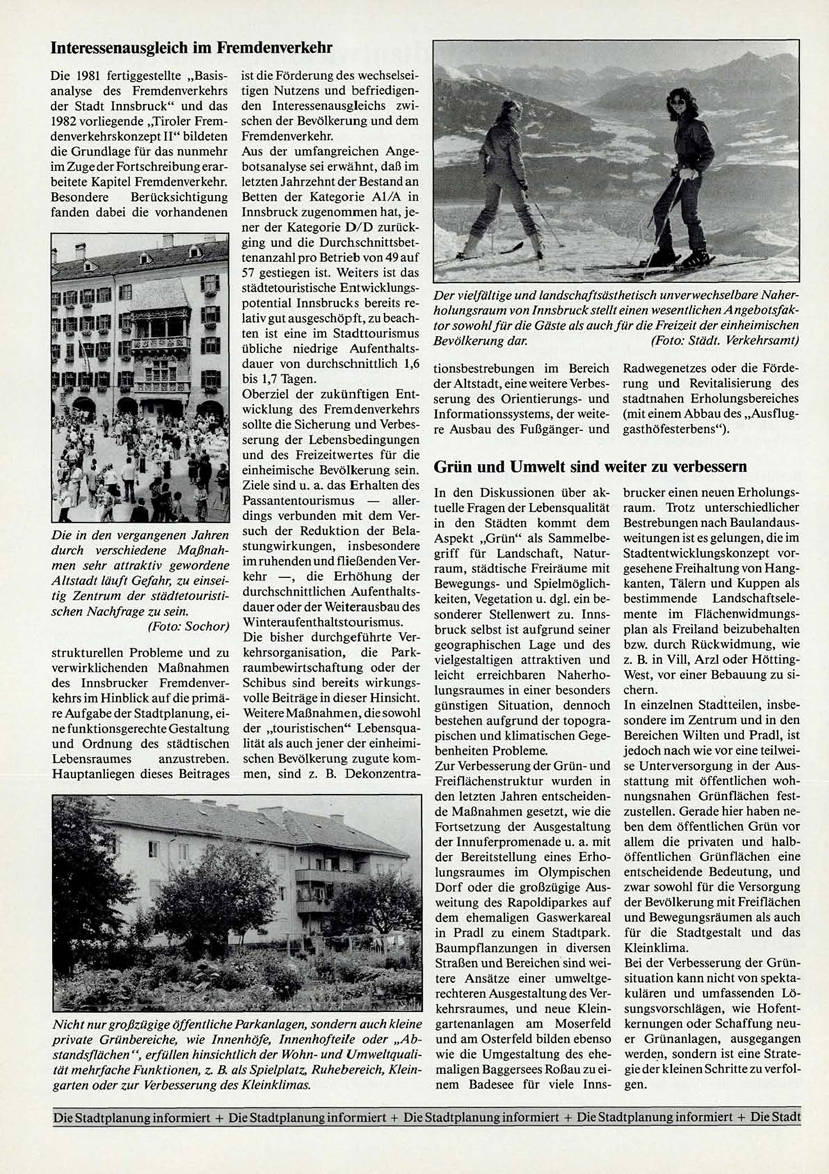 Die 1981 fertiggestellte „Basis- ist die Förderung des wechselseianalyse des Fremdenverkehrs tigen Nutzens und befriedigender Stadt Innsbruck" und das den Interessenausgleichs zwi1982 vorliegende „Tiroler Frem- schen der Bevölkerung und dem