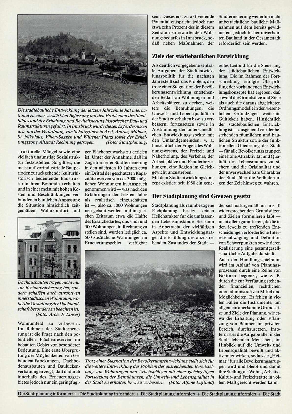 Raumstrukturen geführt. In Innsbruck wurde diesen Erfordernissen bessern, fortzusetzen sowie in der städtebaulichen Entwicku. a. mit der Verordnung von Schutzzonen inArzl, Amras, Mühlau, Abstimmung der unterschiedli- lung ist — ausgehend von der beSt. Nikolaus, Villen-Saggen und Wiltener Platzl sowie der Erhal- chen Entwicklungsaspekte mit stehenden räumlichen und bautungszone Altstadt Rechnung getragen.