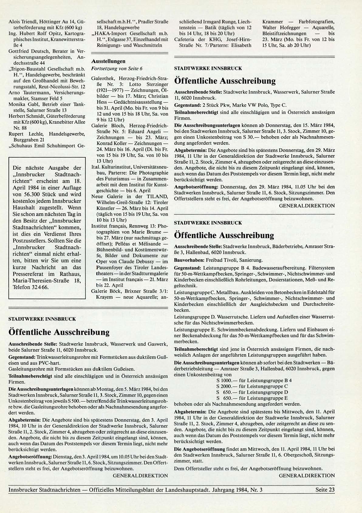 Angebotseröffnung: Dienstag, den 3. A p r i l 1984, um 10.05 U h r bei den Stadtwerken Innsbruck, Salurner Straße 11,6. Stock, Sitzungszimmer. Den Offertstellern steht es frei, der A n g e b o t s e r ö f f n u n g beizuwohnen.