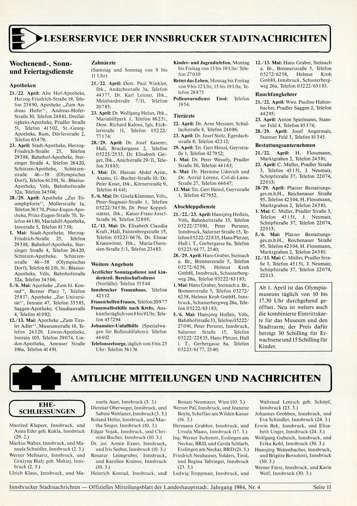 Innsbrucker Stadtnachrichten — Offizielles Mitteilungsblatt der Landeshauptstadt. Jahrgang 1984, Nr. 4