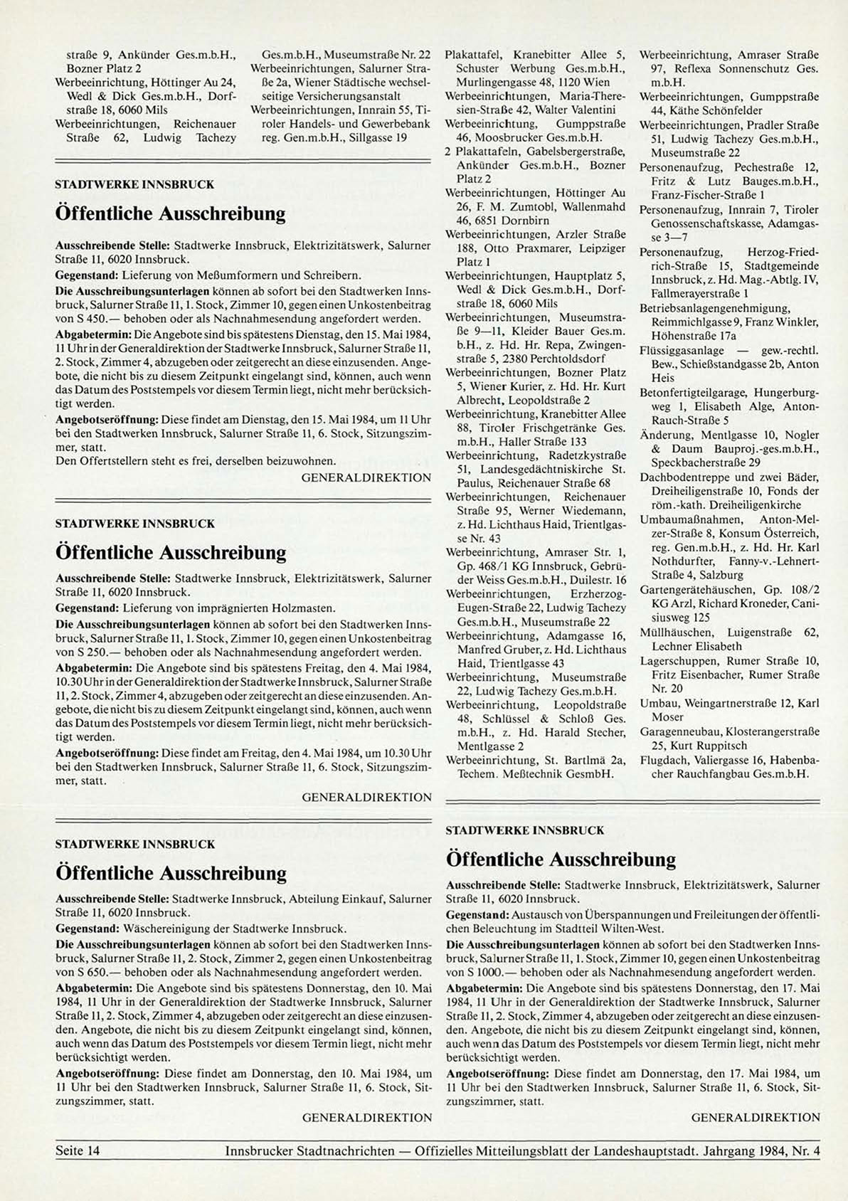 Innsbrucker Stadtnachrichten — Offizielles Mitteilungsblatt der Landeshauptstadt. Jahrgang 1984, Nr. 4