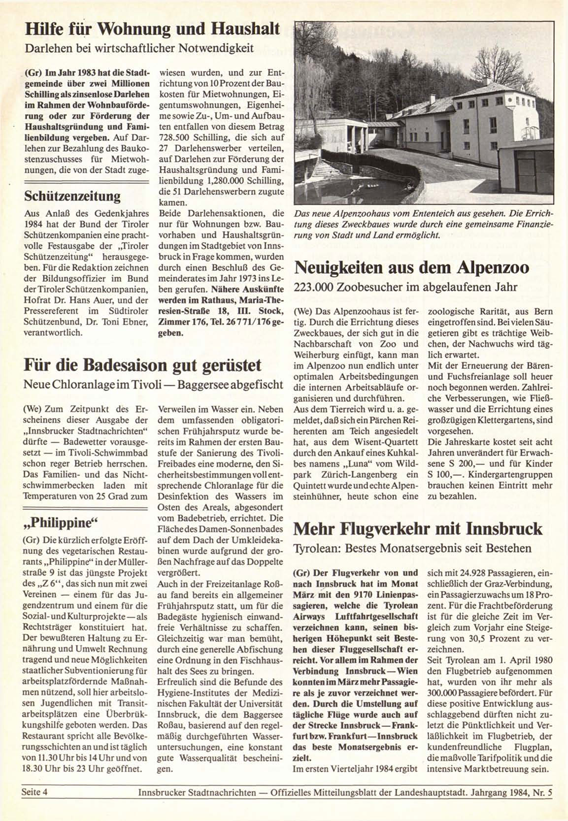 Innsbrucker Stadtnachrichten — Offizielles Mitteilungsblatt der Landeshauptstadt. Jahrgang 1984, Nr. 5