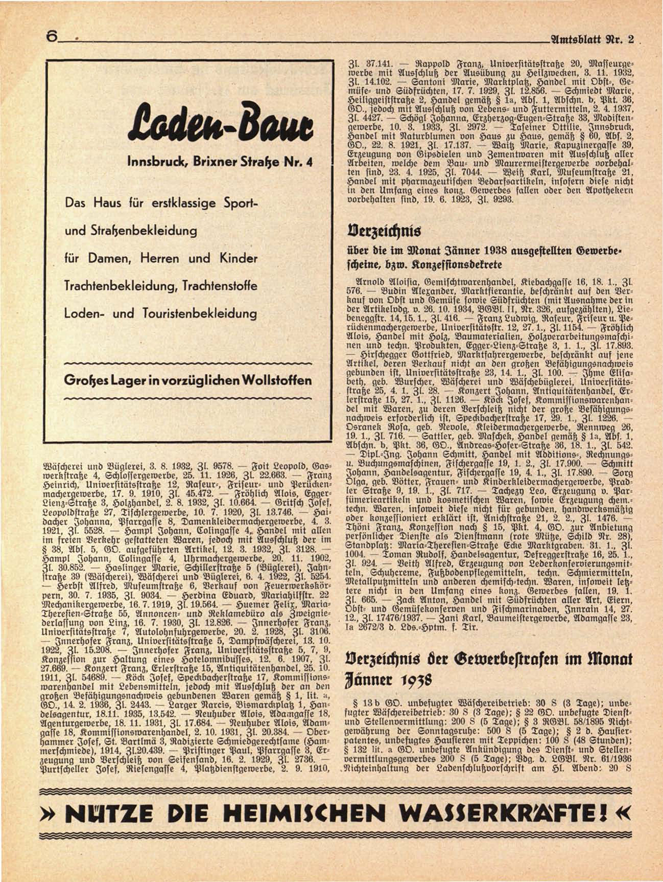 über die im Monat Jänner 1938 ausgestellten Gewerbe»