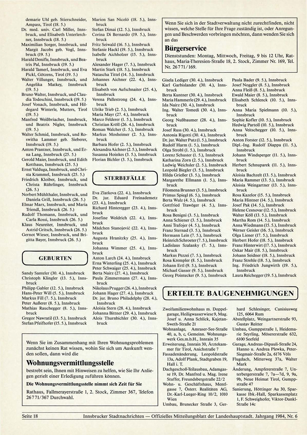 Innsbrucker Stadtnachrichten — Offizielles Mitteilungsblatt der Landeshauptstadt. Jahrgang 1984, Nr. 6