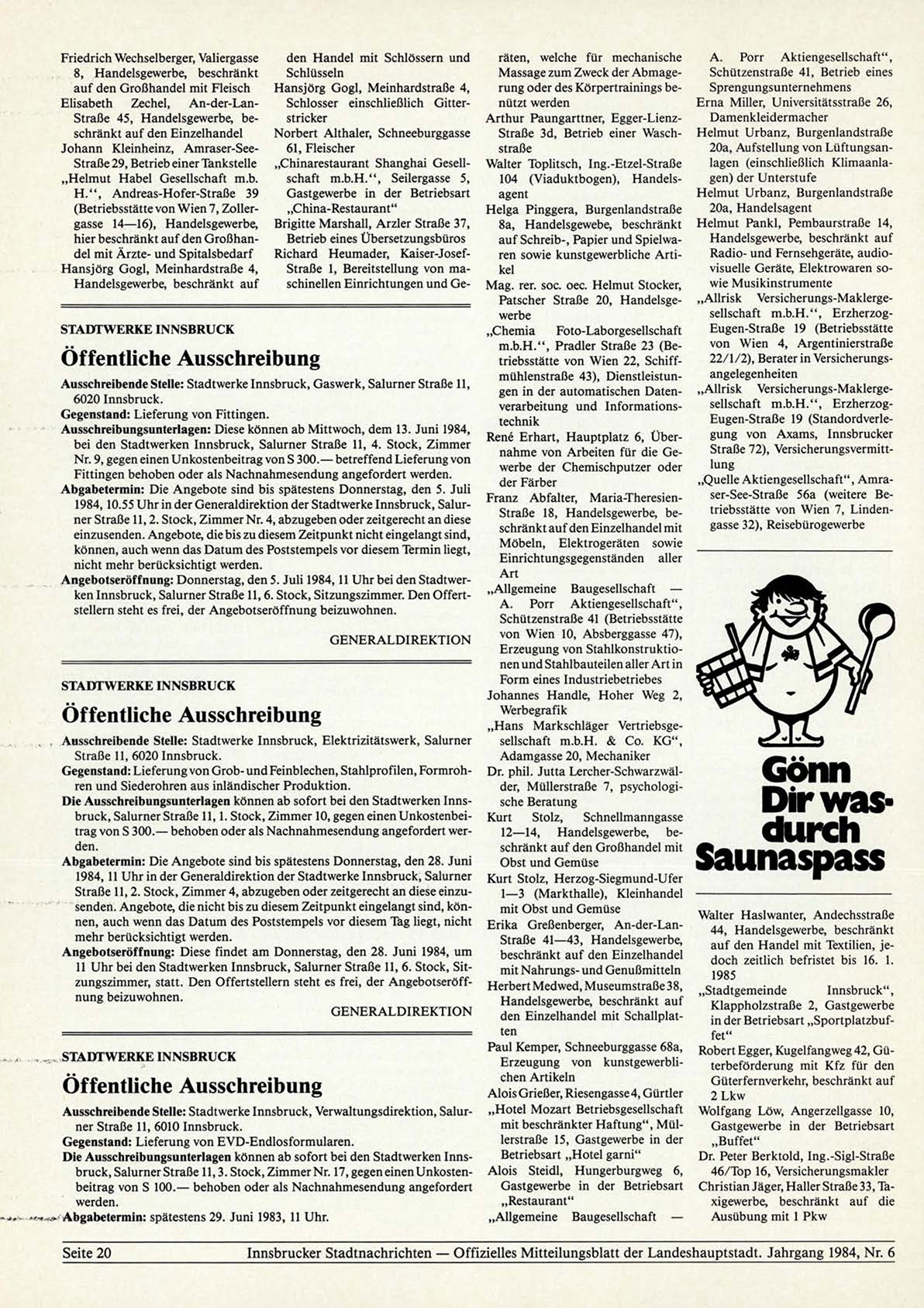 Angebotseröffnung: Donnerstag, den 5. Juli 1984,11 U h r bei den Stadtwerken Innsbruck, Salurner Straße 11,6. Stock, Sitzungszimmer. Den Offertstellern steht es frei, der A n g e b o t s e r ö f f n u n g beizuwohnen.