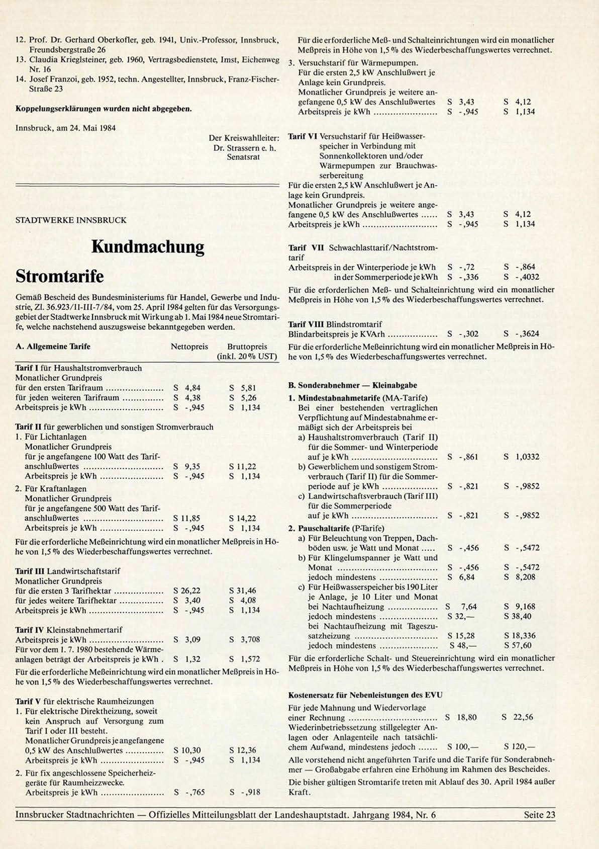 G e m ä ß Bescheid des Bundesministeriums f ü r Handel, Gewerbe und Industrie, ZI. 36.923/11-III-7/84, vom 25. A p r i l 1984 gelten f ü r das Versorgungsgebiet der Stadtwerke Innsbruck mit W i r k u n g ab 1. M a i 1984 neue Stromtarife, welche nachstehend auszugsweise bekanntgegeben werden.