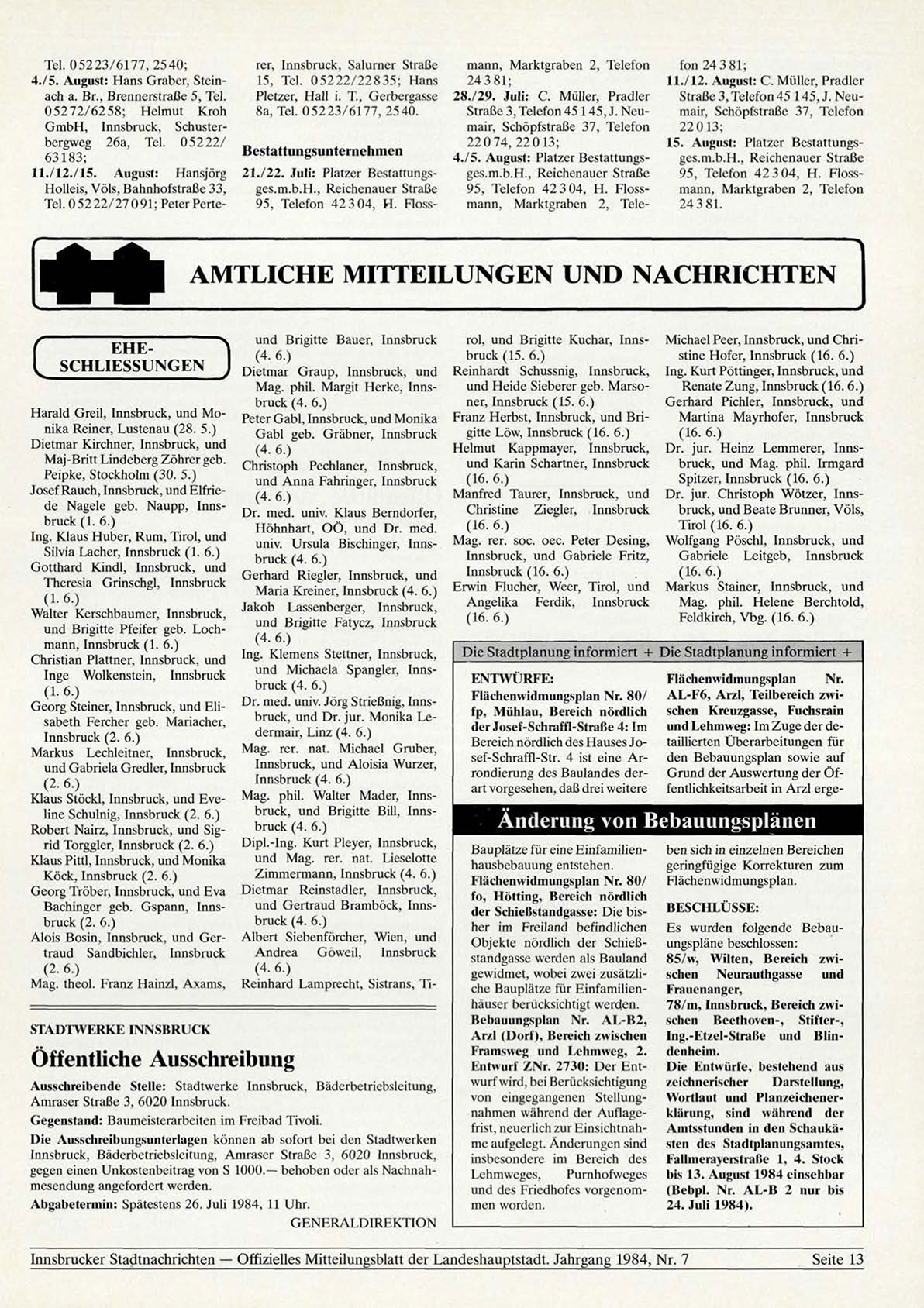 Innsbrucker Stadtnachrichten — Offizielles Mitteilungsblatt der Landeshauptstadt. Jahrgang 1984, N r . 7