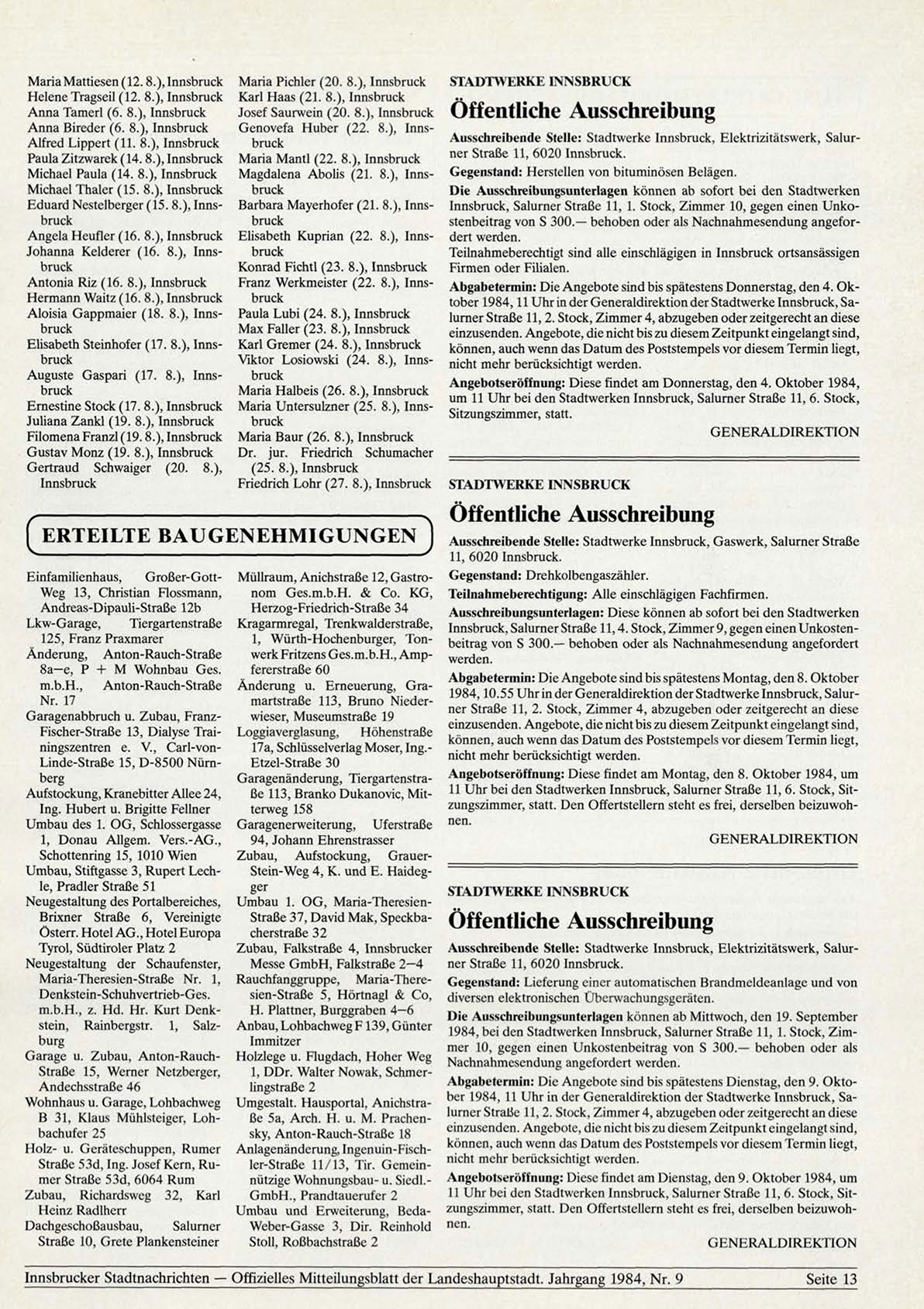 1984,10.55 Uhr in der Generaldirektion der Stadtwerke Innsbruck, Salurner Straße 11, 2. Stock, Zimmer 4, abzugeben oder zeitgerecht an diese