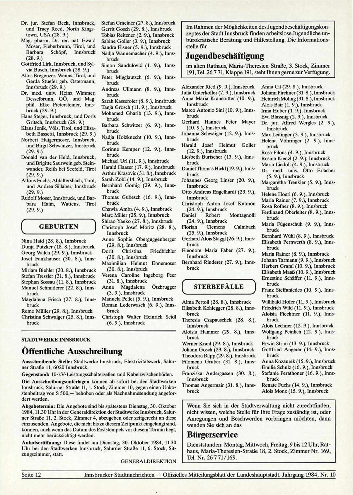 1984,11.30 Uhr in der Generaldirektion der Stadtwerke Innsbruck, Salurner Straße 11, 2. Stock, Zimmer 4, abzugeben oder zeitgerecht an diese