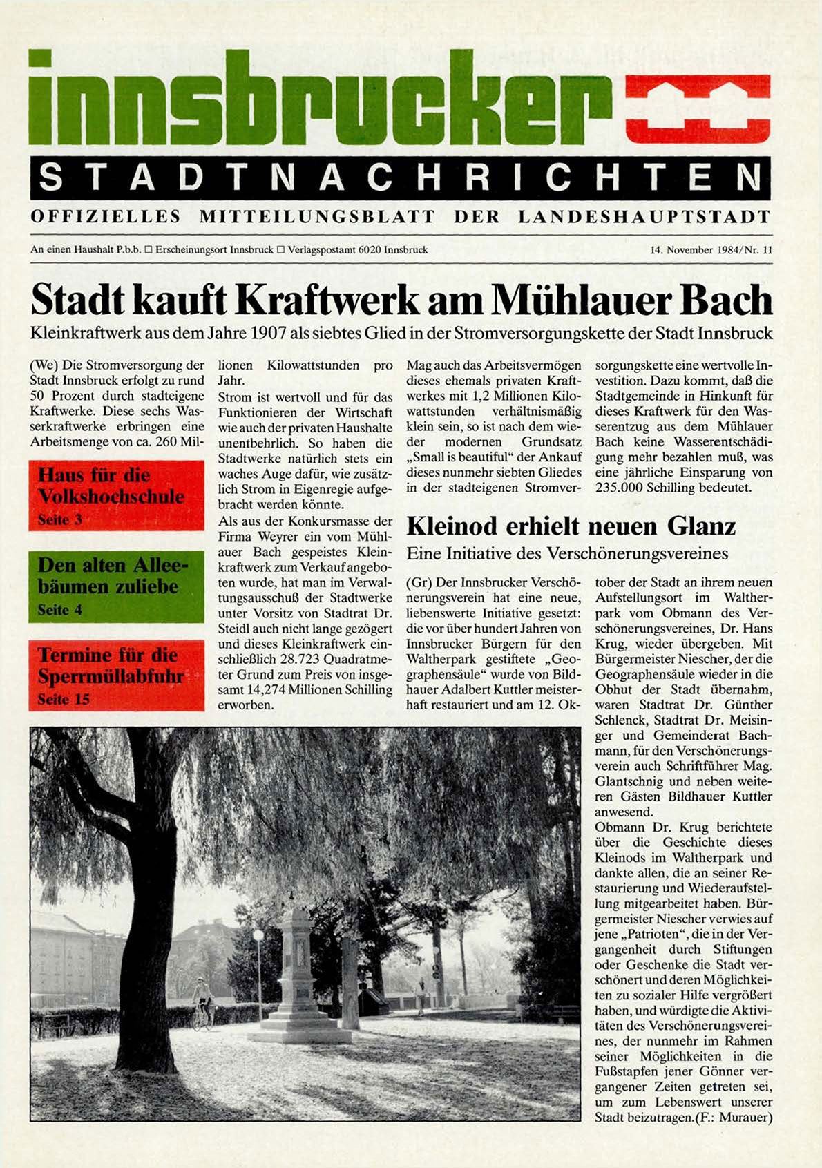 Firma Weyrer ein vom Mühlauer Bach gespeistes Kleinkraftwerk zum Verkauf angeboten wurde, hat man im Verwaltungsausschuß der Stadtwerke