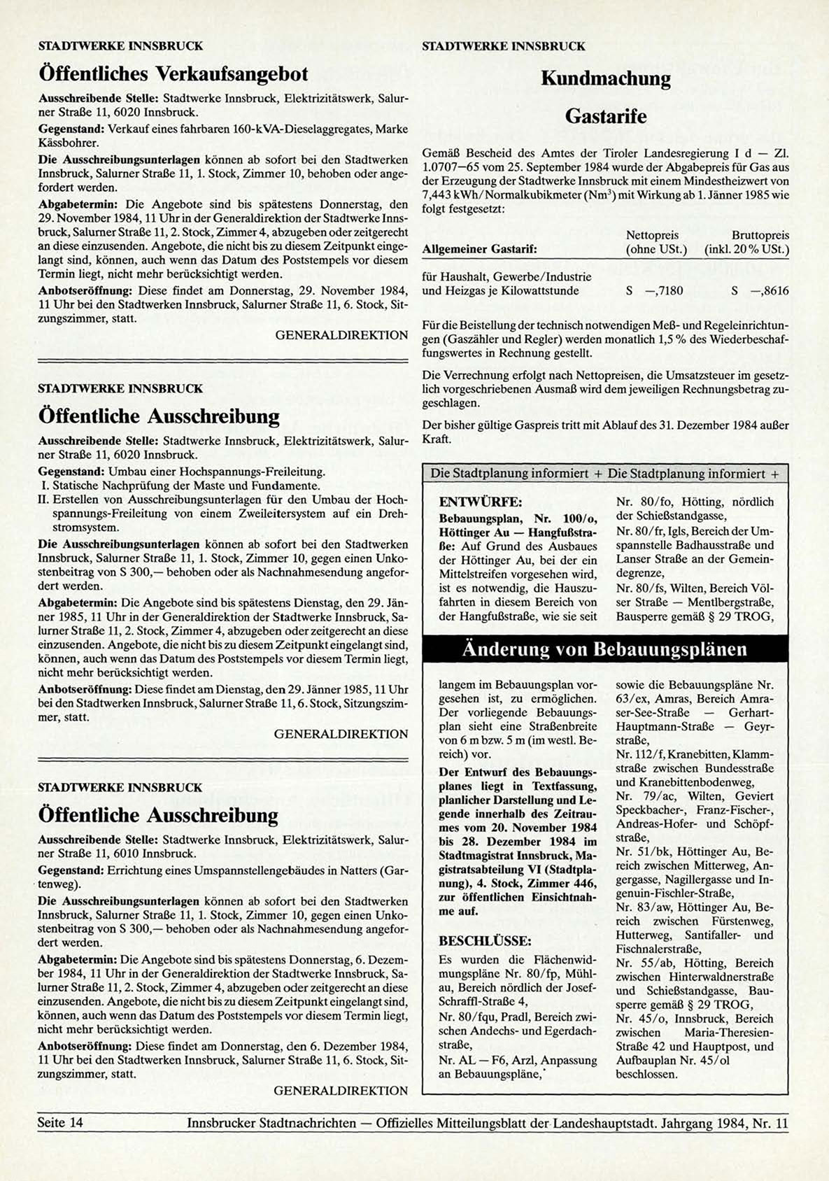 29. November 1984,11 Uhr in der Generaldirektion der Stadtwerke Innsbruck, Salurner Straße 11,2. Stock, Zimmer 4, abzugeben oder zeitgerecht