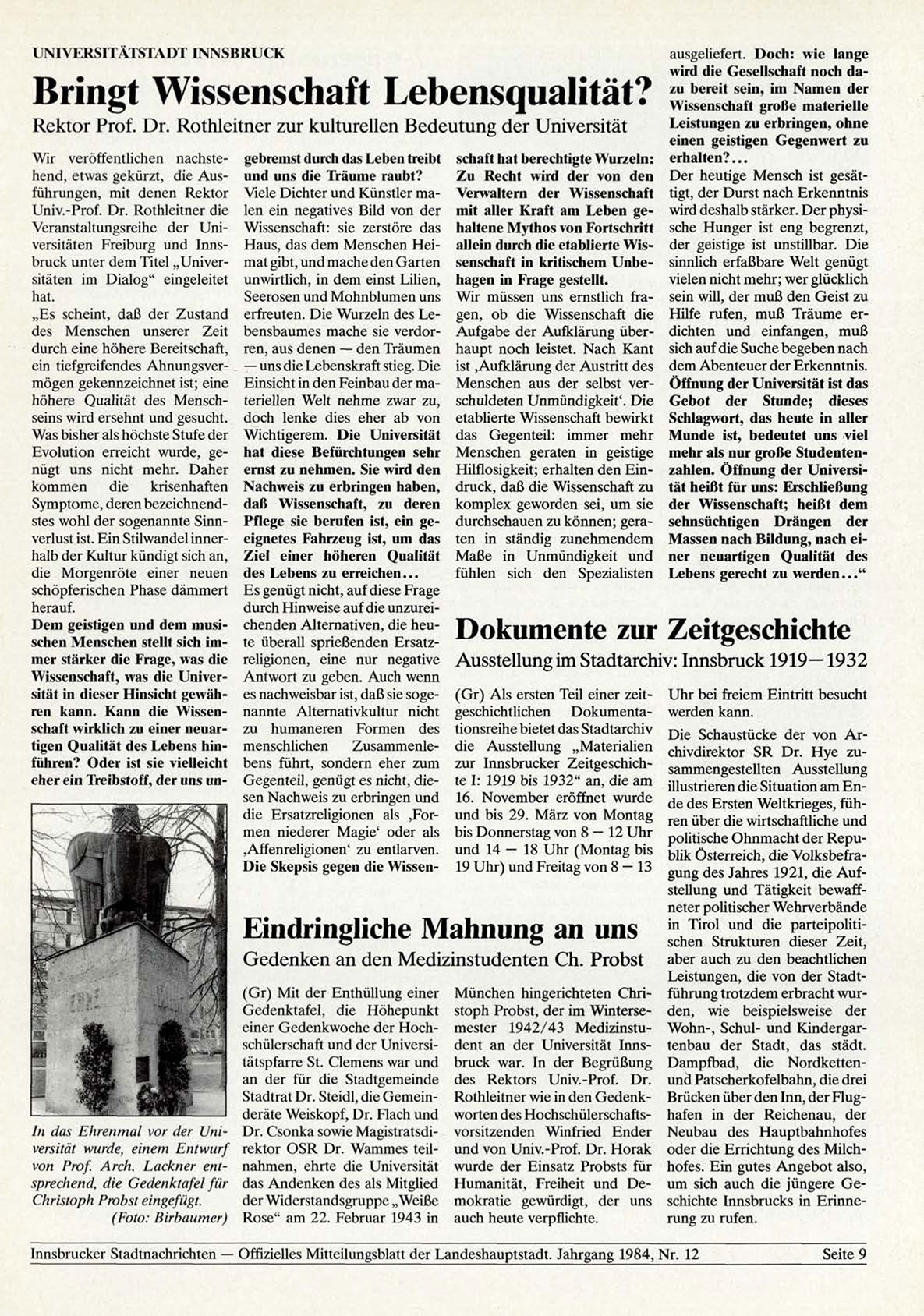 Innsbrucker Stadtnachrichten — Offizielles Mitteilungsblatt der Landeshauptstadt. Jahrgang 1984, Nr. 12
