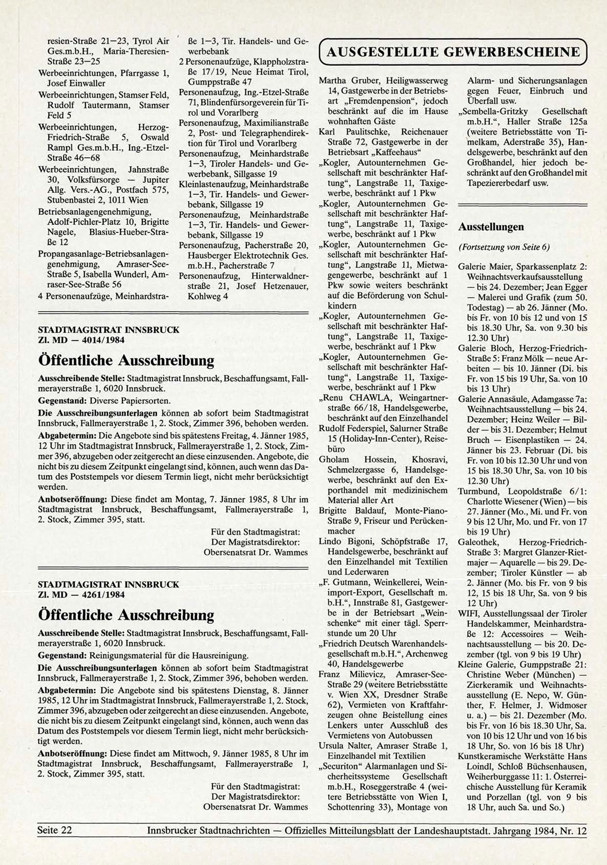 Innsbrucker Stadtnachrichten — Offizielles Mitteilungsblatt der Landeshauptstadt. Jahrgang 1984, Nr. 12