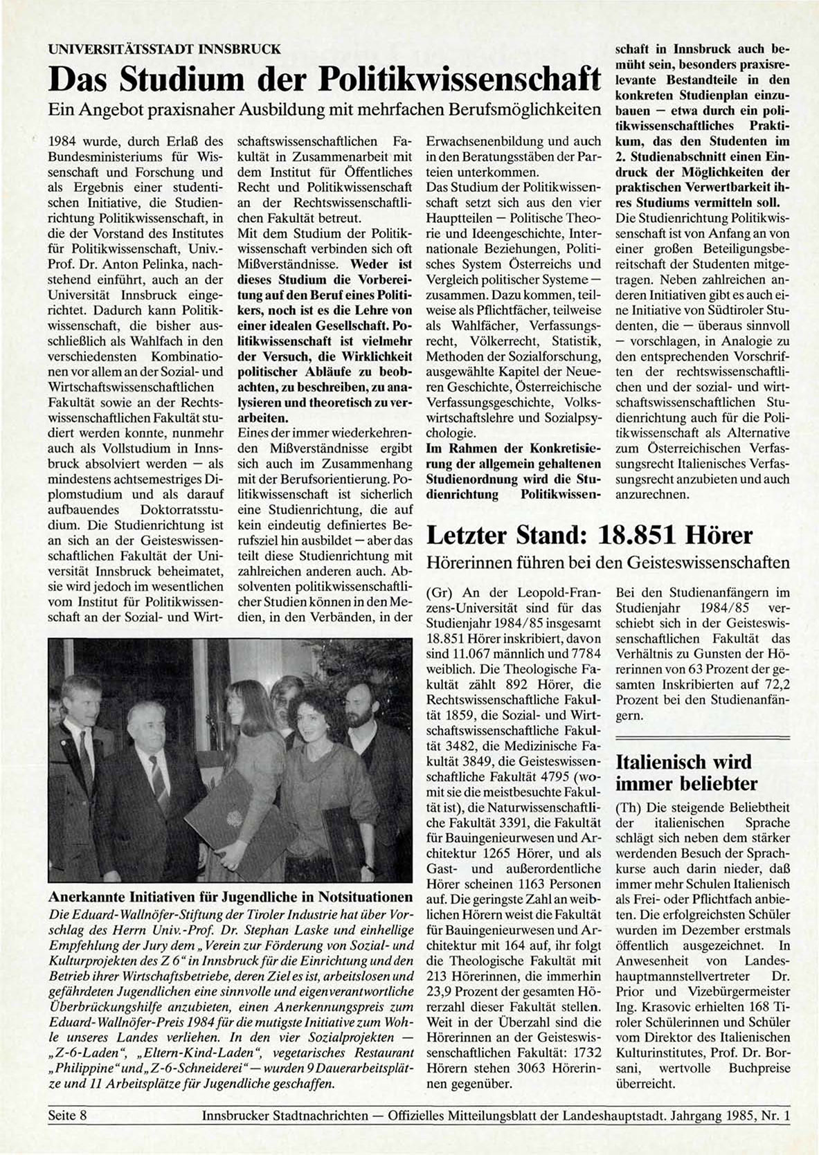 Innsbrucker Stadtnachrichten — Offizielles Mitteilungsblatt der Landeshauptstadt. Jahrgang 1985, Nr. 1