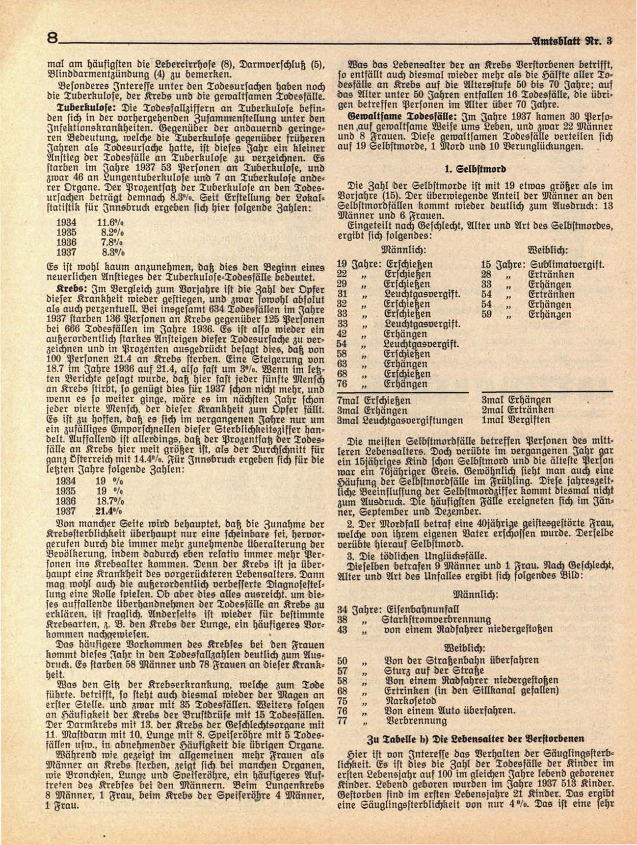 Gewaltsame Todesfälle: I m Jahre 1937 kamen 30 Personen .auf gewaltsame Weife ums Leben, und zwar 22 Männer
