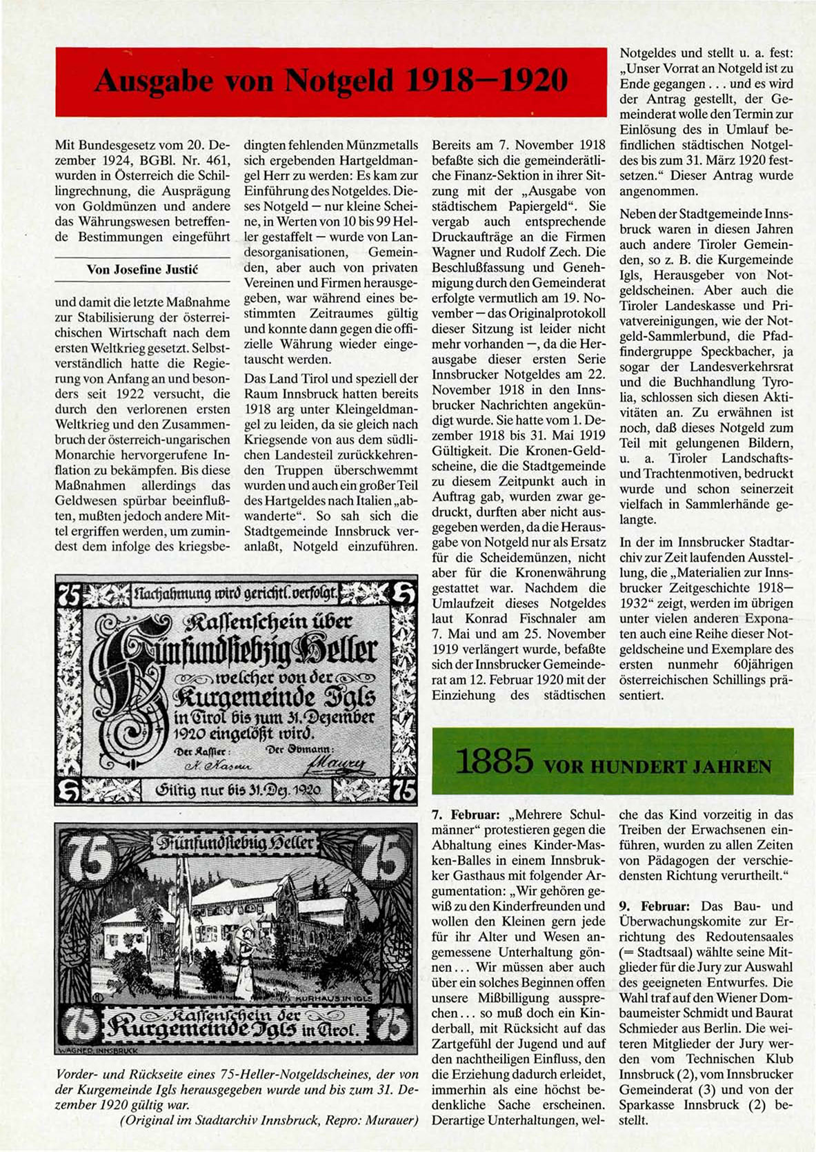 gegeben werden, da die Herausgabe von Notgeld nur als Ersatz In der im Innsbrucker Stadtarfür die Scheidemünzen, nicht chiv zur Zeit laufenden Ausstelaber für die Kronenwährung lung, die „Materialien zur Innsgestattet war. Nachdem die brucker Zeitgeschichte 1918—