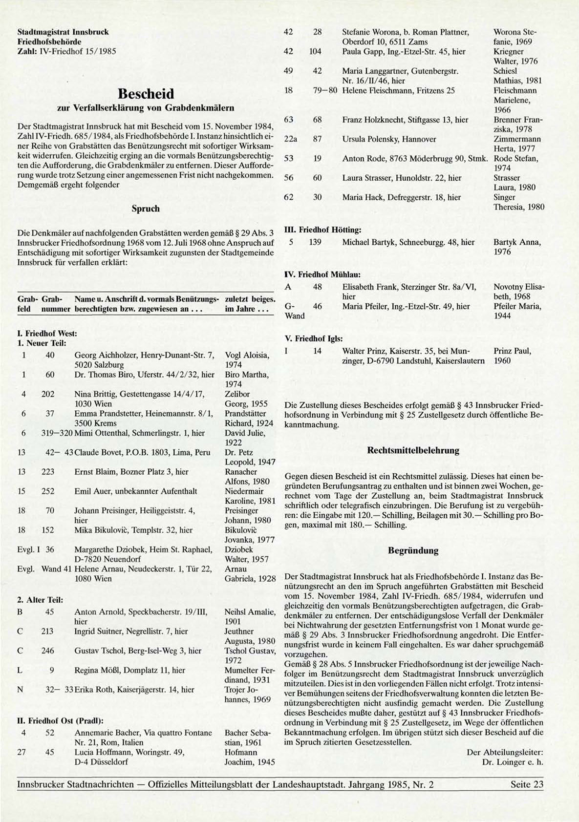 Die Zustellung dieses Bescheides erfolgt gemäß § 43 Innsbrucker Friedhofsordnung in Verbindung mit § 25 Zustellgesetz durch öffentliche Bekanntmachung.