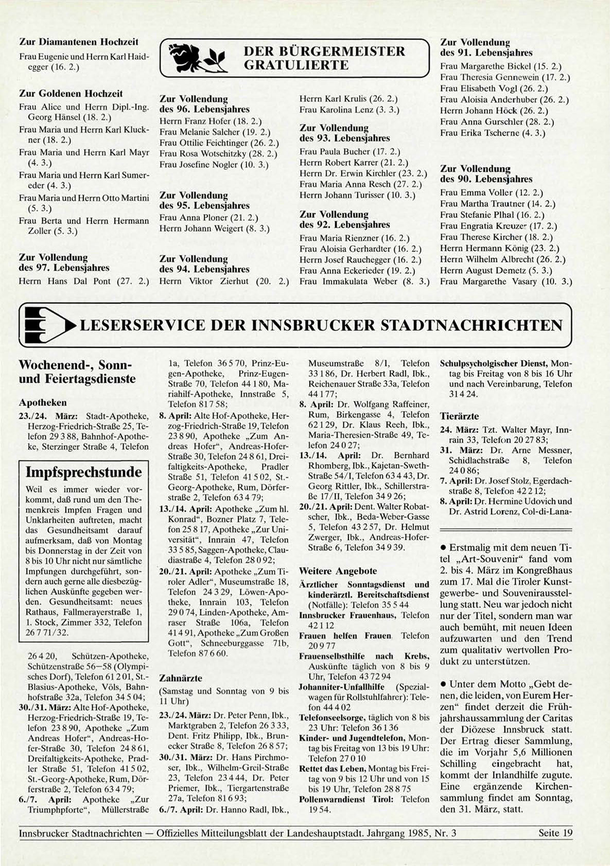 Innsbrucker Stadtnachrichten — Offizielles Mitteilungsblatt der Landeshauptstadt. Jahrgang 1985, Nr. 3